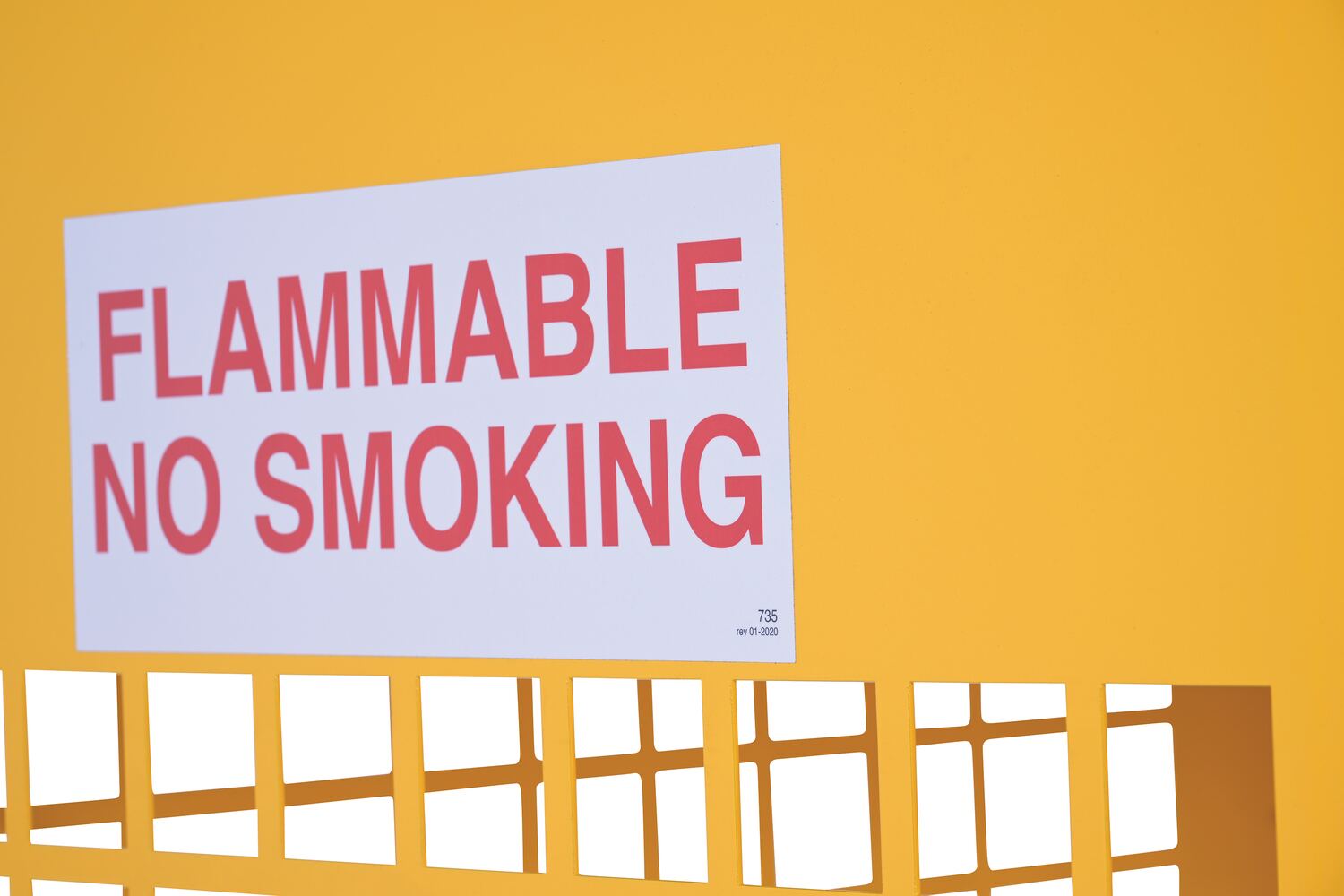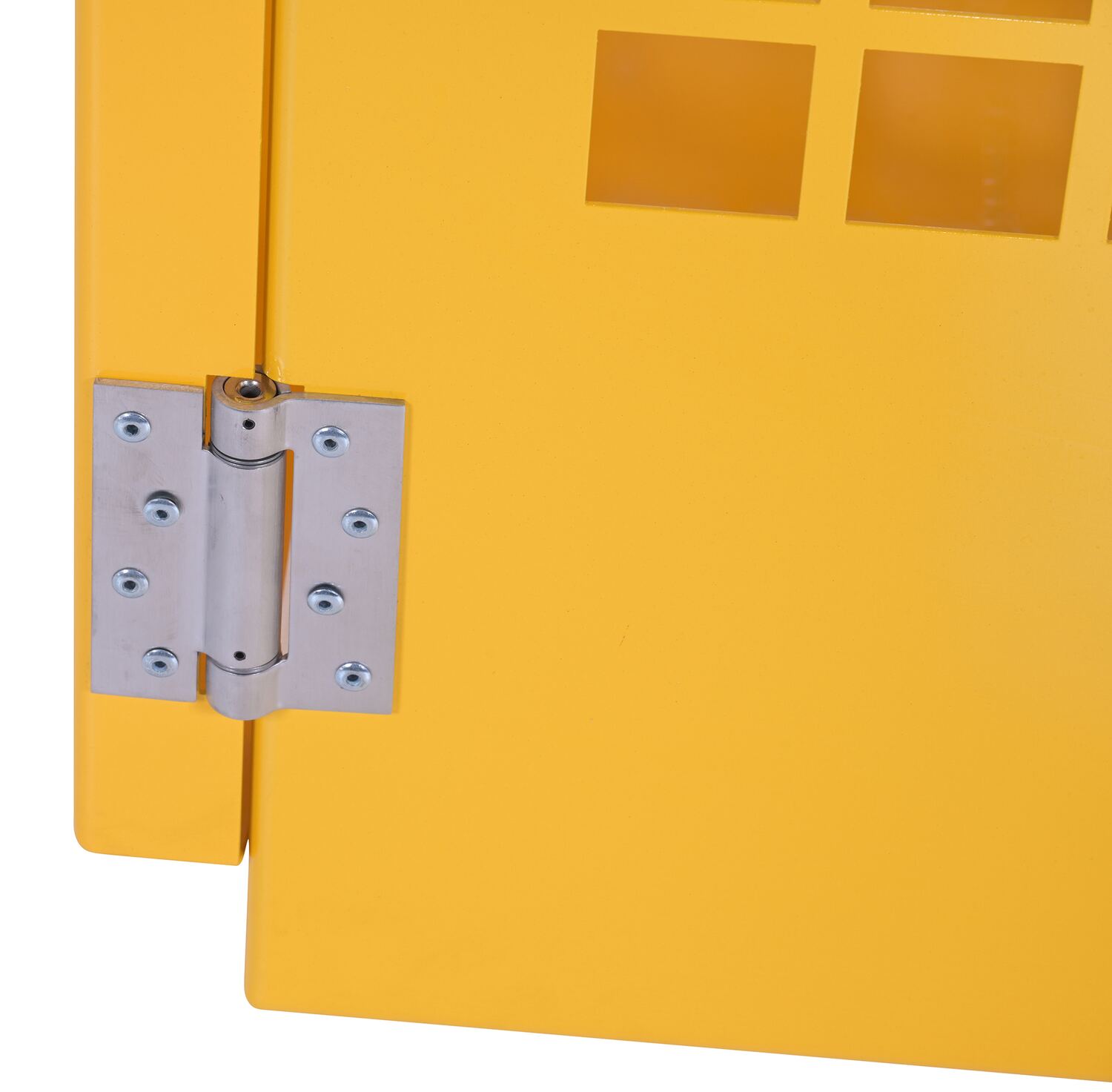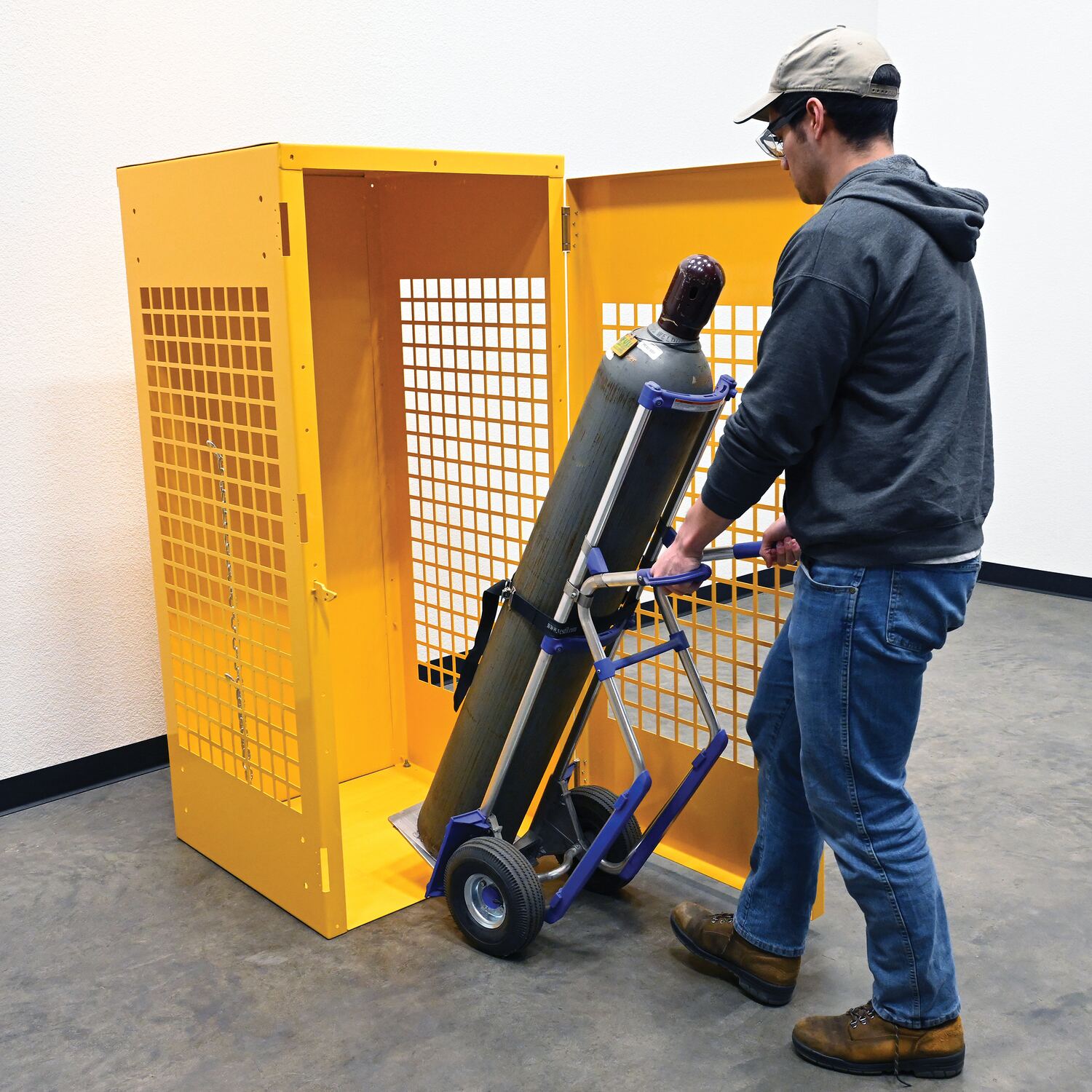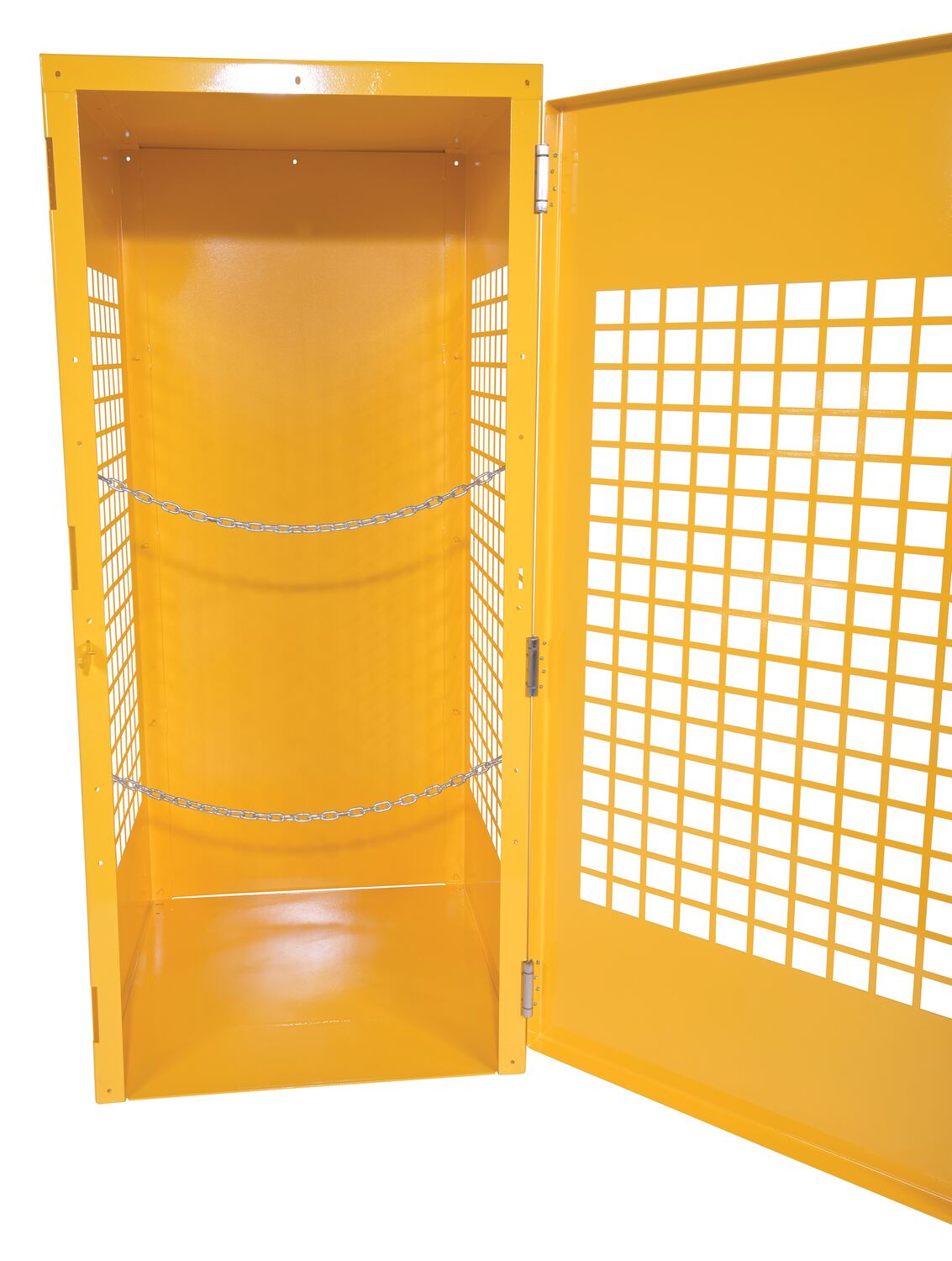 Steel cabinets for storage of cylinders. Cylinder storage capacity is based on cylinder size. Sides are made of expanded steel for an open view design. The top, back, and bottom is made of solid sheet steel. Lockable doors protect cylinders (padlock not included). Base includes lag holes for securing cylinders. Vertical units include chains for securing cylinders. Includes red lettered signage noting "Flammable-No Smoking" contents. Meets OSHA 1910.110 (f)(6)(ii), ANSI NFPA 55 + 58 and CGA P-1 design standards. Rugged steel construction with a baked-in powder coated safety yellow finish for toughness.