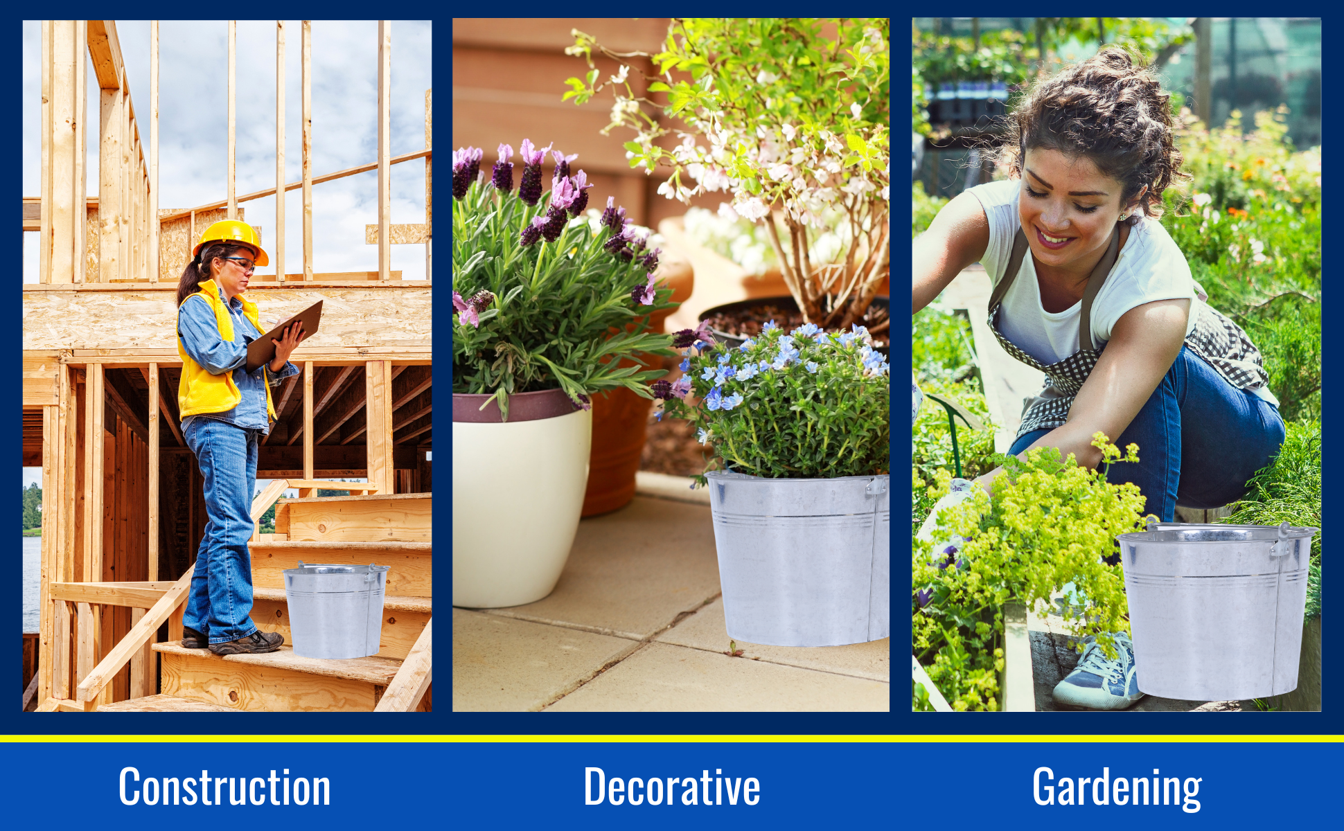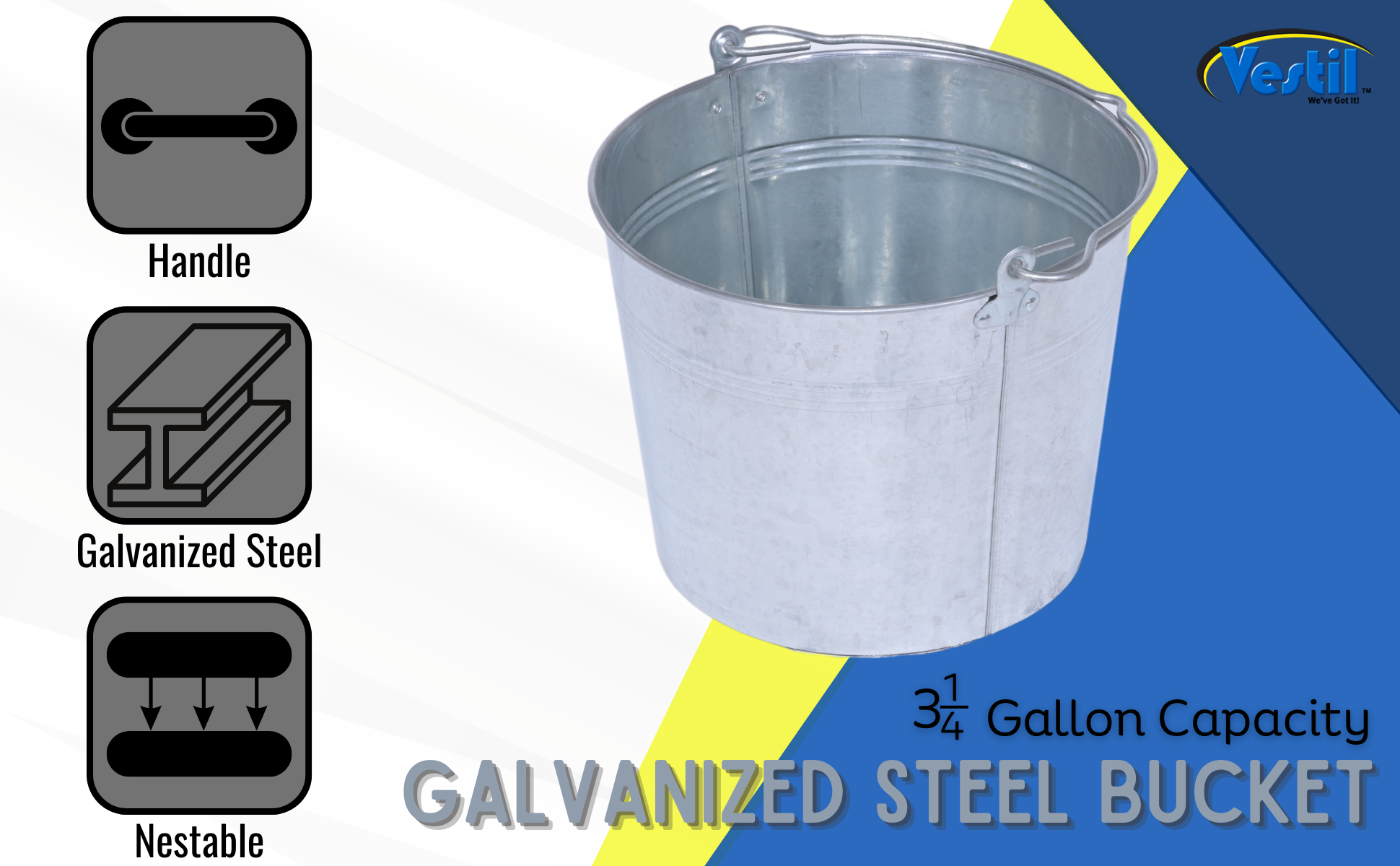 Galvanized and stainless steel buckets are for use in industrial and commercial applications where durability is required. Buckets are nestable and come standard with a carrying handle/bail for easy transport.