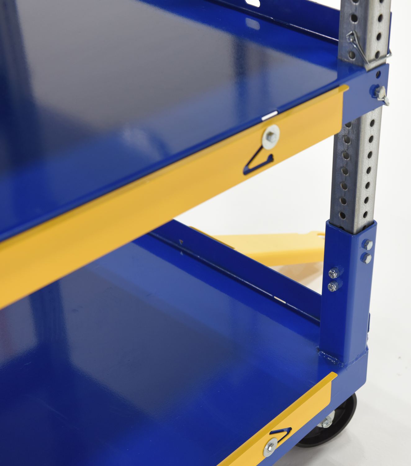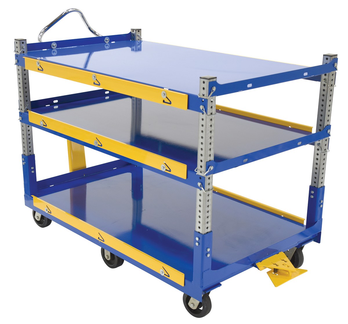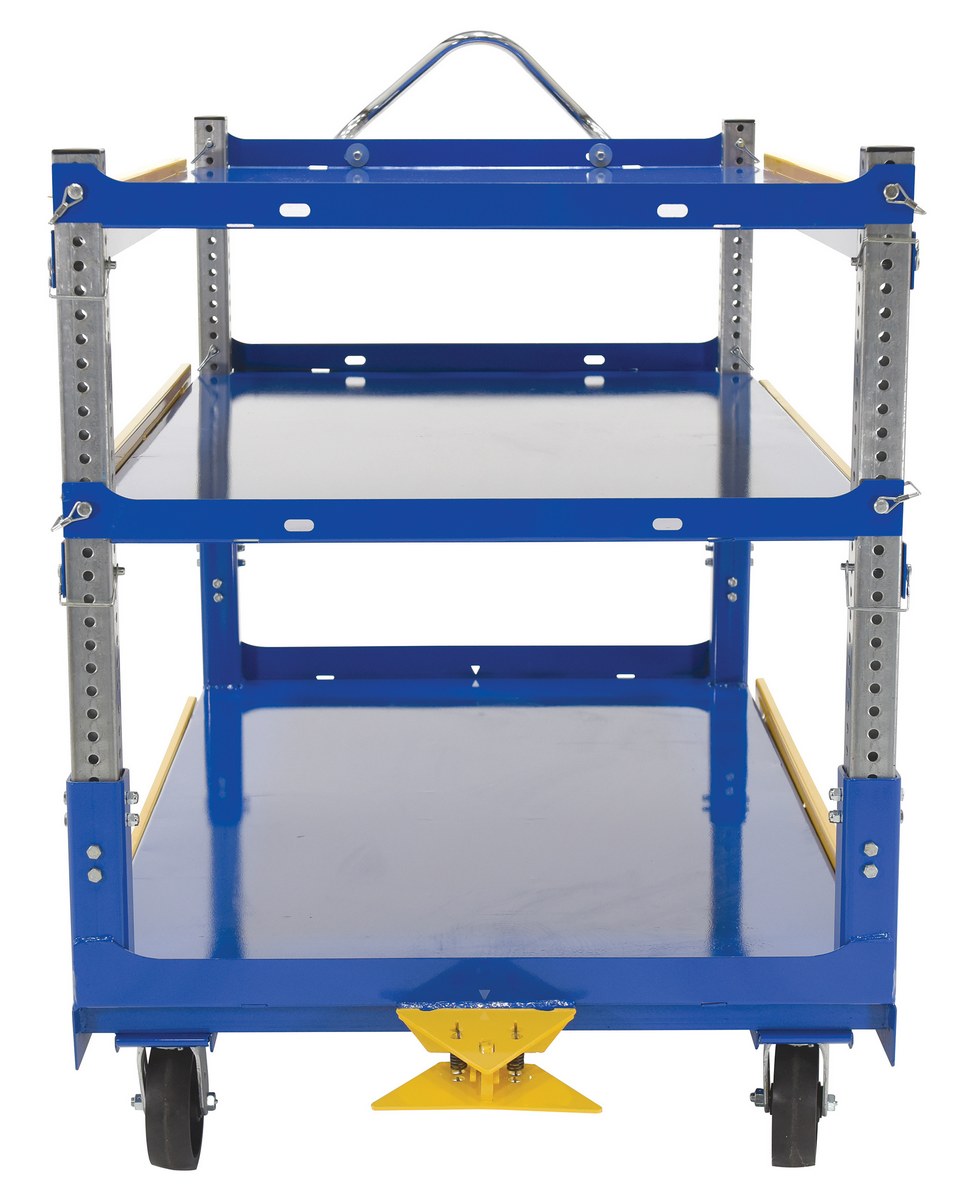 The adjustable ergonomic cart is the perfect asset to a number of facilities including shipping and handling to hospitality. A strong construction with a tall handle diminishes bending and twisting while loading and unloading products. The top two tiers can be adjusted in height with a simple pull of a pin to let larger sized products be transferred securely. The unit rolls on the users choice of glass-filled nylon or mold-on rubber casters for a smooth transition.