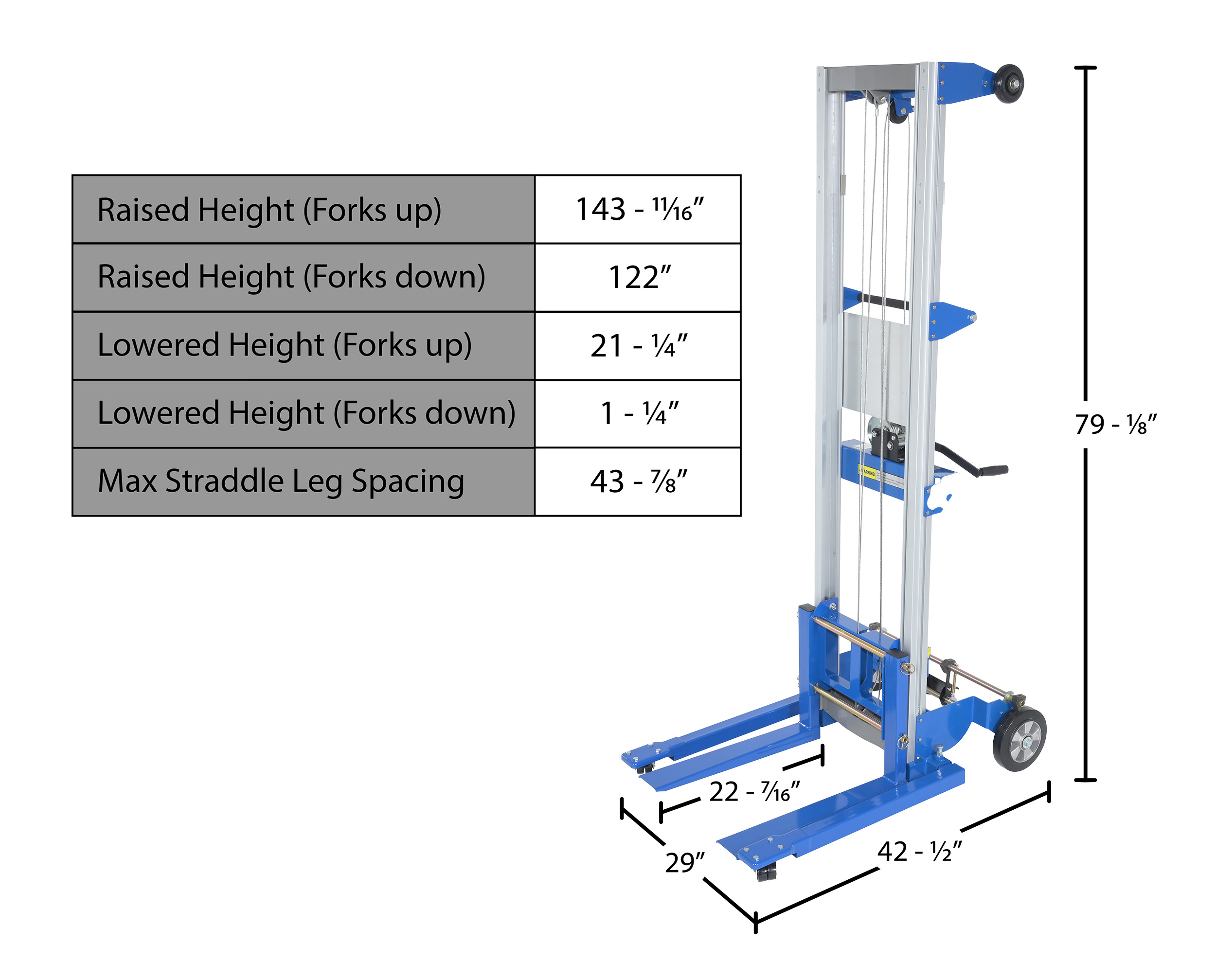 Fork Width/Length (in.): 4 x 22-7/16 Fork Spacing (in.): 20-7/8 Adjustable Leg Spacing (in.): 29 to 43-7/8