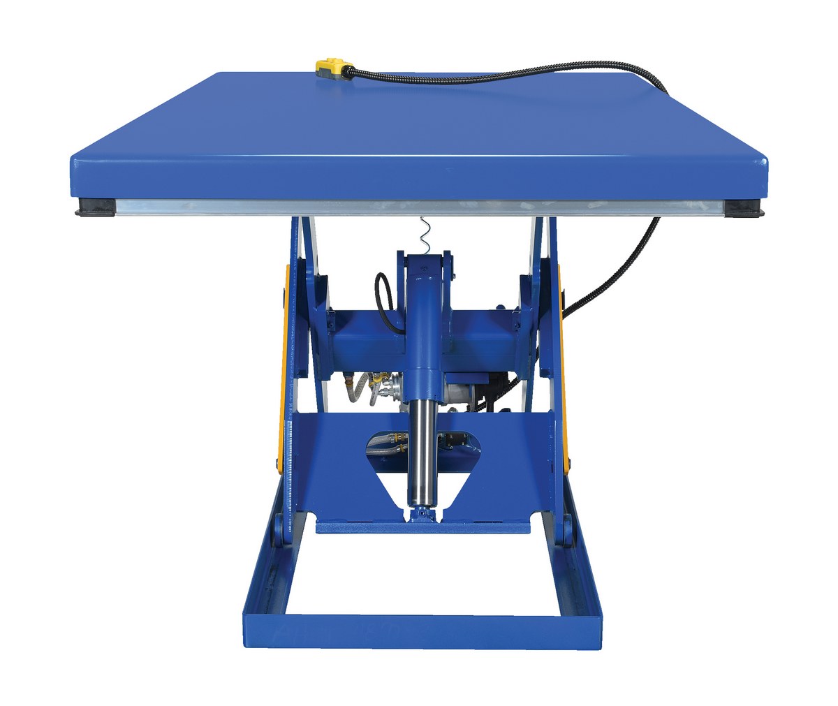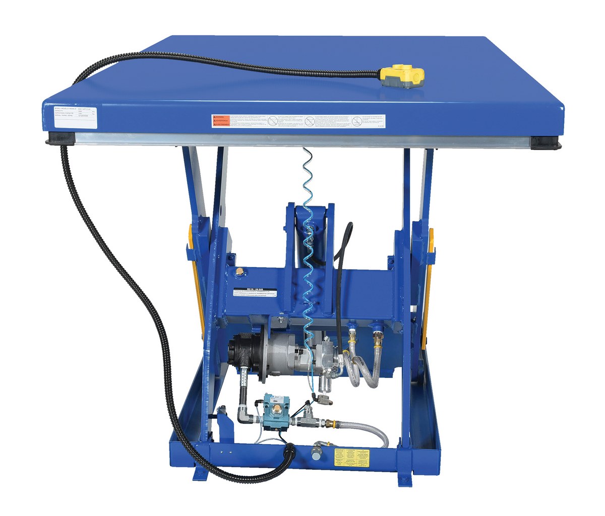 The rotary air/Hydraulic scissor lift table utilizes the convenience of factory air to power the lift table. Simply connect to an air supply through a filter, regulator, lubricator, and you will have a lift table suitable for a wide range of applications and operating environments. It features a pneumatic upper travel limit switch, safety toe guards, cylinder with internal safety velocity fuse, two button hand control, and life-time lubricated sleeve bearings.