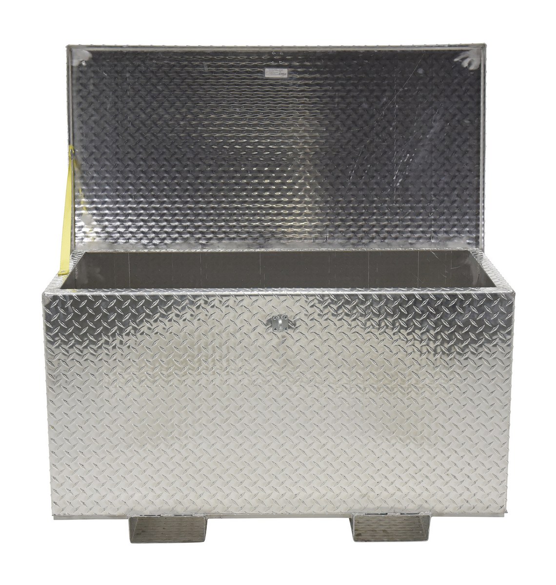 The Aluminum portable toolbox is excellent for storing and transporting equipment. The heavy duty welded aluminum tread plate construction is designed to tolerate the toughest of environments. Additional features also include ergonomically friendly carrying handles on each end for smooth manual transporting and a hinged lid which includes a lockable double hinged hasp for added security. Fork pockets are attached to the units underbelly for lifting and maneuvering between areas.