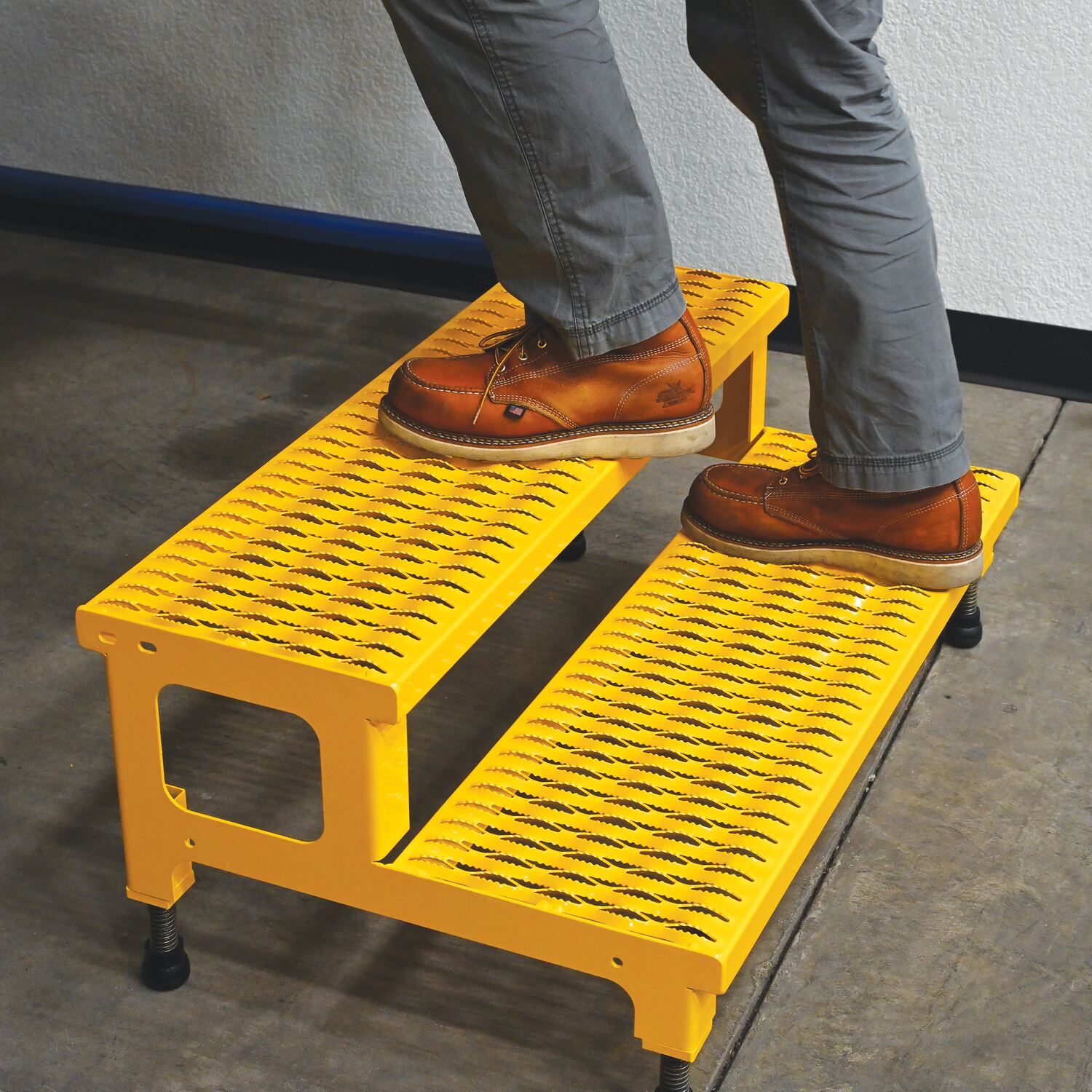 Steel Adjustable Step Mate Stand 2 Step 22-7/8 In. x 36-3/16 In. x 15-1/4 In. 500 Lb. Capacity YellowThe adjustable step-mate stand can be used as either a comfortable worker platform or a semi-permanent step. The serrated surface ensures safe footing. The legs adjust individually by screwing them into or out of the leg base.