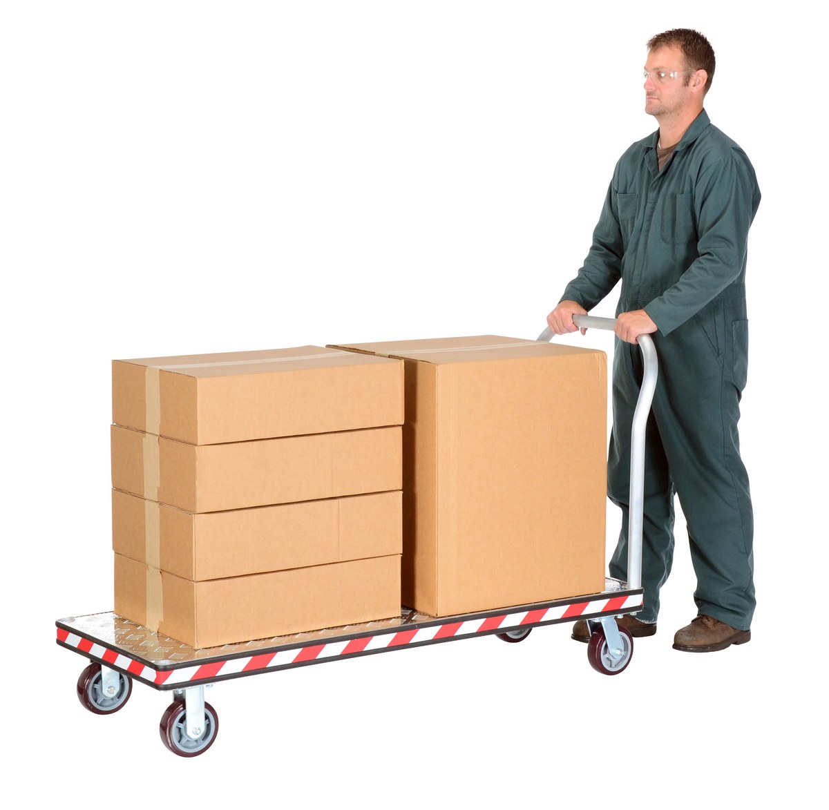 An aluminum tread plate platform truck is a great addition a variety of settings. Fitted with non-marking rubber protective buffer strip to protect walls and door frames during transit. Design allows items to be loaded and unloaded from multiple sides. The poly-on-poly casters roll smoothly over surfaces.