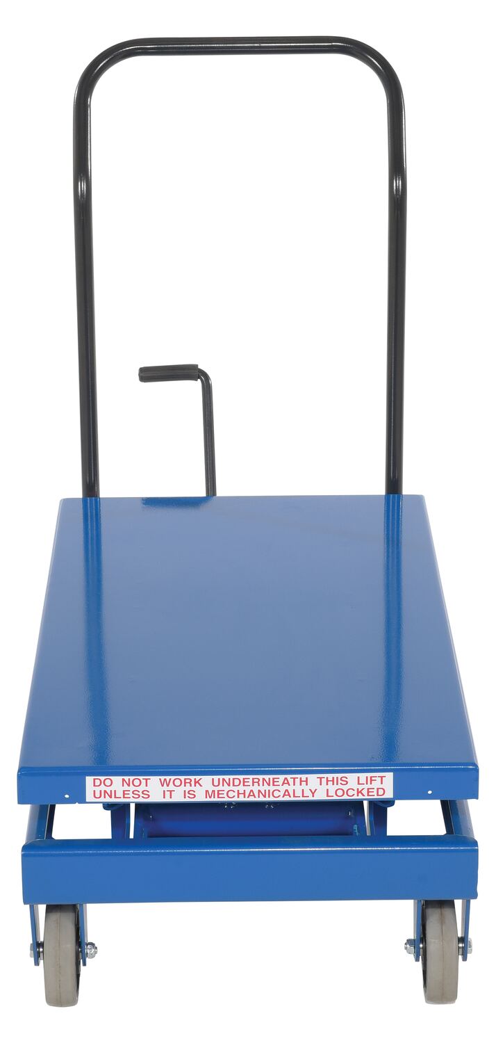 The premium scissor lift cart is constructed of heavy duty steel and designed to withstand the most demanding industrial environments. The simplicity and compactness of these products make them ideal for lifting and transporting loads, order-picking, die handling, and for use in support of assembly operations. There is little exertion required to raise and lower the deck due to the high quality foot-actuated, single speed hydraulic pump. The hydraulic system is equipped with an overload protection valve. Each cart has safety stops to prevent an empty deck from lowering while performing maintenance. A unique tilt-up table top allows for safe and easy maintenance. The two rigid front casters and two rear swivel polyurethane casters with brake provide a high degree of maneuverability; each swivel wheel is protected by guards and is equipped with brakes. Features an internal safety velocity fuse in each cylinder.