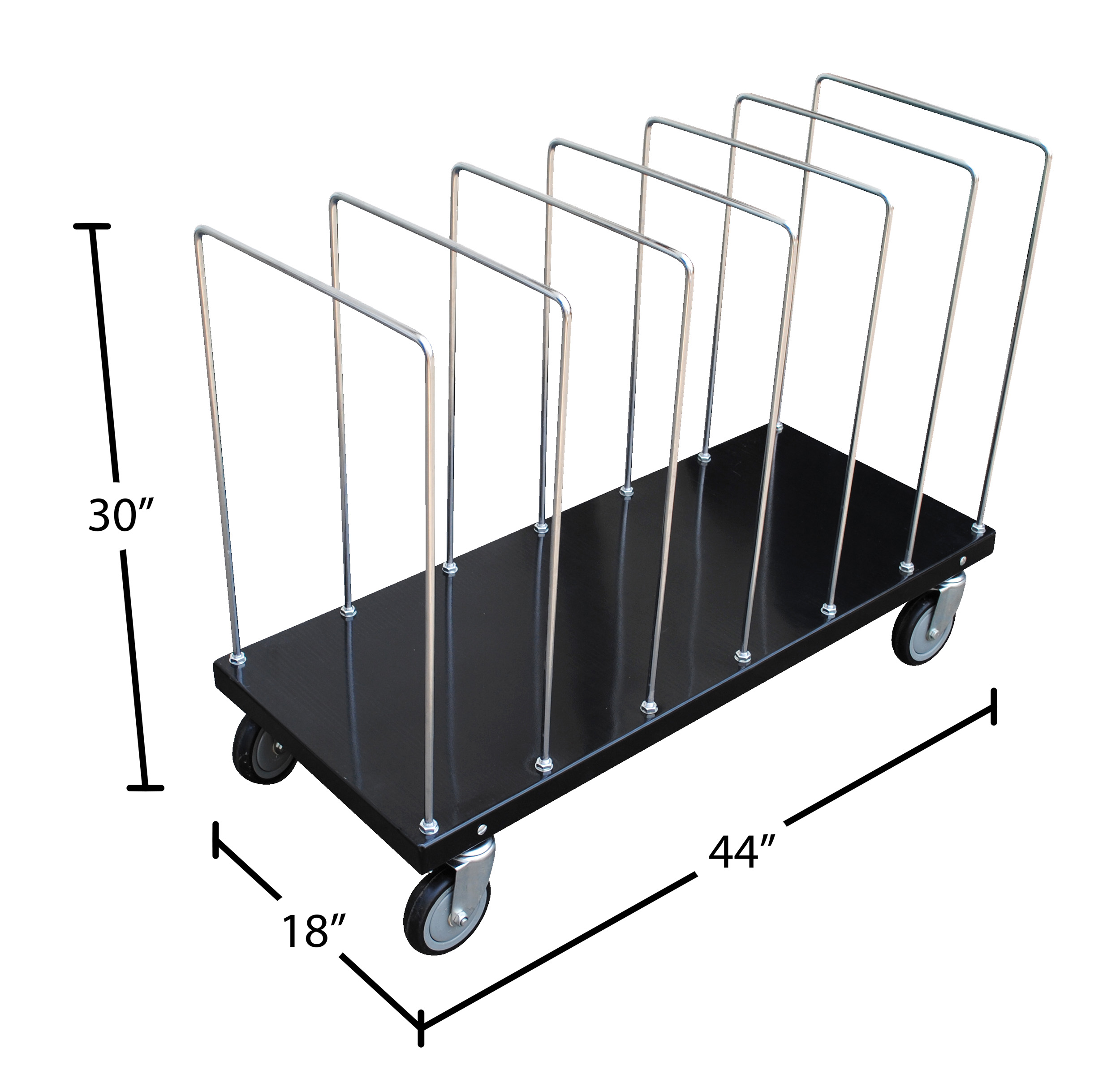 The portable carton cart is designed to store, organize, and transport your empty cardboard boxes. Unit has chrome plated uprights and frame dividers with powder coated black shelves. The cart has adjustable box dividers that are ideal for oversized boxes. The seven dividers can be positioned along the cart deck in any of seven pre-drilled positions. Cart rolls on four swivel (4) poly-on-poly casters.