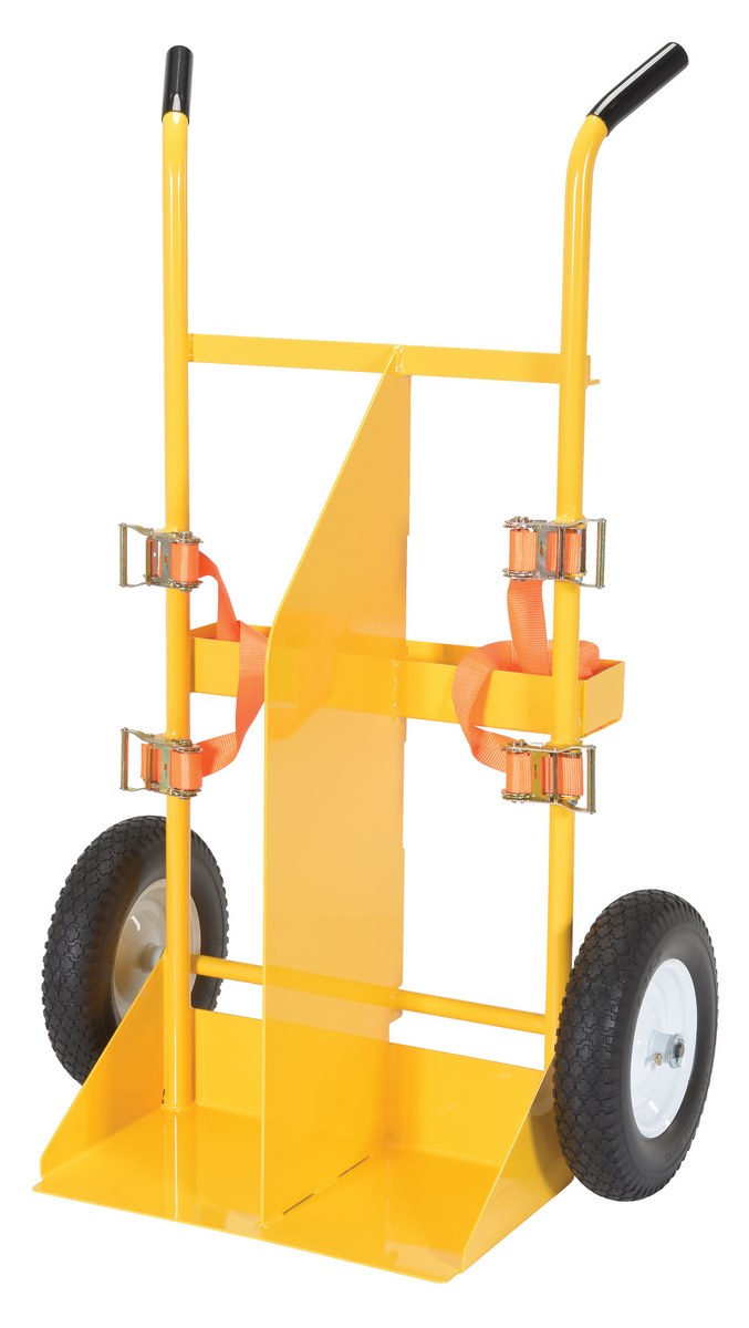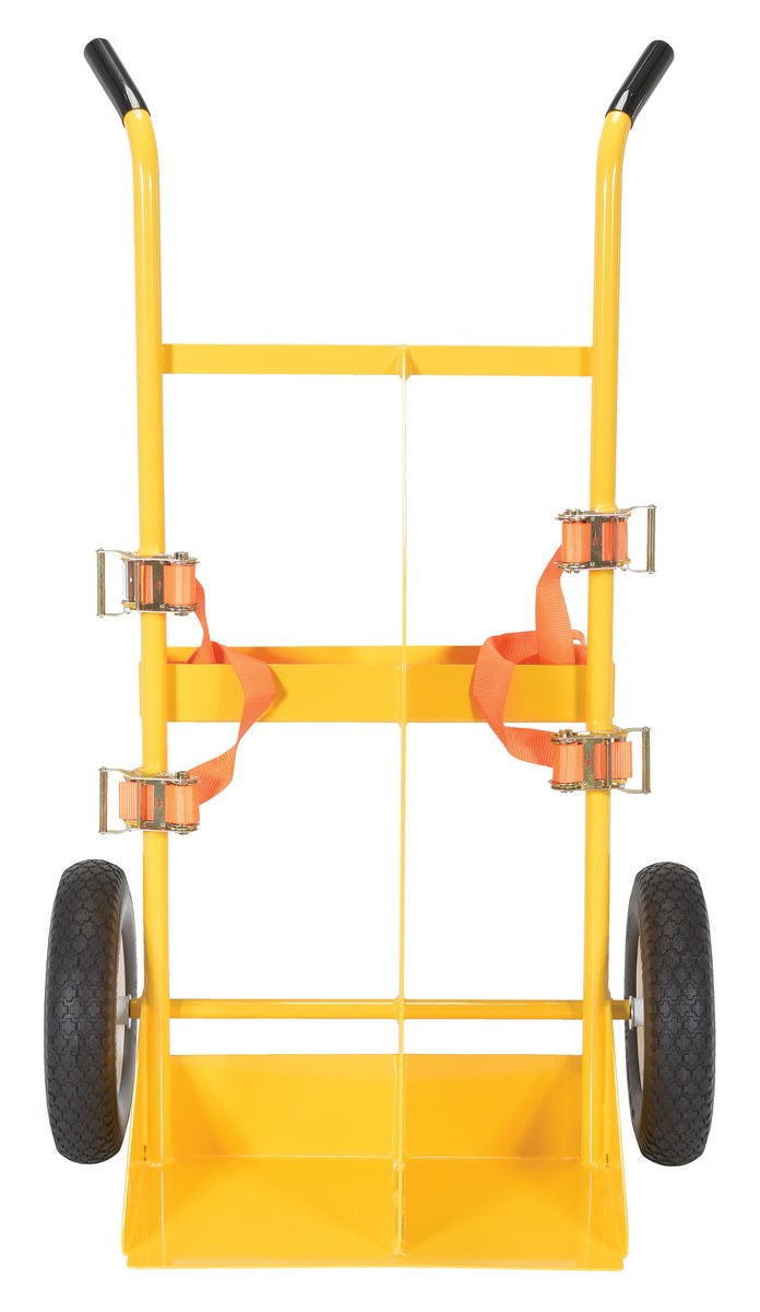 The welding Cylinder torch cart is designed for transporting cylinders and cutting torch. Includes two (2) tank compartments with heavy-duty ratchet straps. Convenient open-top storage tray. Sturdy handles and large wheels for tilt-n-go portability. Welded steel construction with powder coat finish. Not designed for use as a storage means for gas cylinders.