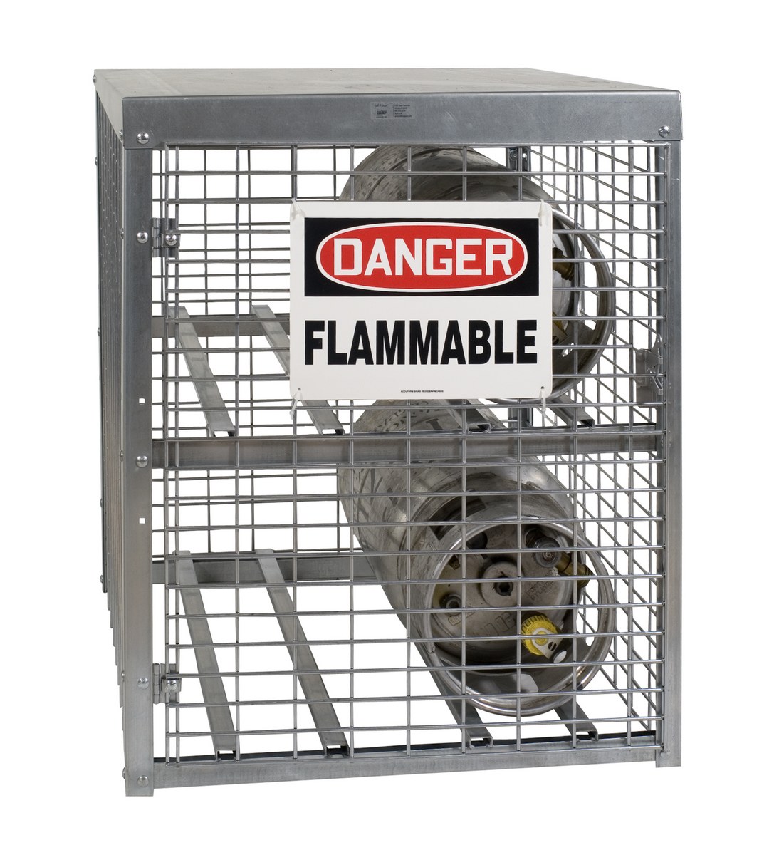 Store LP tanks horizontally and acetylene tanks vertically in this heavy-duty Galvanized Cylinder storage cabinet. Made of all steel construction, this rust resistant cabinet has galvanized welded wire sides with sturdy square steel angle frames and a durable galvanized steel roof. The galvanized rust resistant finish stands up to harsh outdoor environments. Features a "danger flammable materials" sign, and all necessary hardware. Meets OSHA requirements.