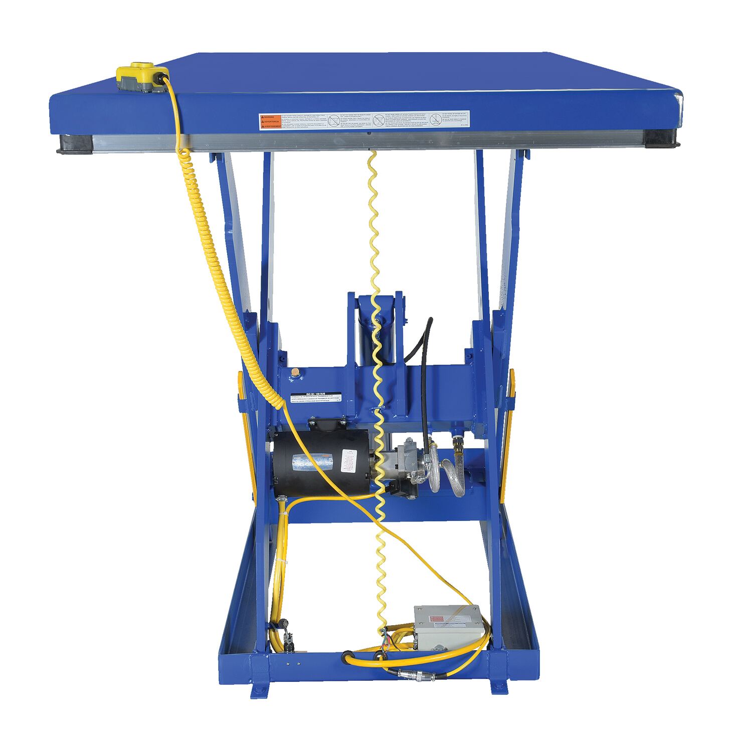The electric hydraulic scissor lift table is used by all types of manufacturing and warehouse facilities. Safety features include a patented pinch point perimeter toe guard to protect pinch points while lowering the table, fused push button control, internal safety velocity fuse to maintain platform height in the event of hose or fitting failure, integral maintenance prop, adjustable upper travel limit switch to stop the table at maximum height, and displacement-style hydraulic cylinders for maximum strength. It also features a pressure plated pump, manifold system, and state-of-the-art lifetime lubricated bearings. The standard 56 frame electric motor is fully enclosed with additional voltage options available. Contact factory if platform dimensions are crucial.