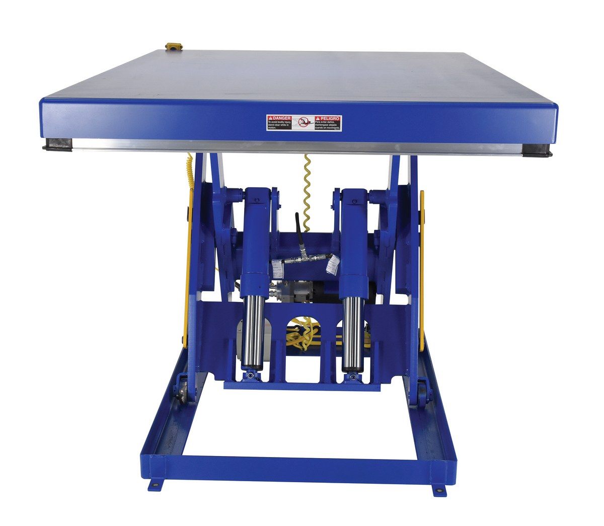 The electric hydraulic scissor lift table is used by all types of manufacturing and warehouse facilities. Safety features include a patented pinch point perimeter toe guard to protect pinch points while lowering the table, fused push button control, internal safety velocity fuse to maintain platform height in the event of hose or fitting failure, integral maintenance prop, adjustable upper travel limit switch to stop the table at maximum height, and displacement-style hydraulic cylinders for maximum strength. It also features a pressure plated pump, manifold system, and state-of-the-art lifetime lubricated bearings. The standard 56 frame electric motor is fully enclosed with additional voltage options available. Contact factory if platform dimensions are crucial.