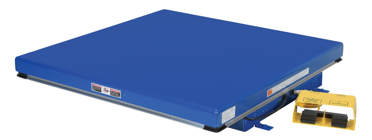 Steel Electric Hydraulic Lift Table with Foot Control 48 In. x 48 In. 2000 Lb. Capacity BlueThe electric hydraulic scissor lift table with foot control is used by all types of manufacturing and warehouse facilities. The unit lifts products to a desired height creating an ergonomically friendly workspace. The lift table is designed with a steel construction for durability and longevity. Additional safety features include a patented pinch point perimeter toe guard to protect pinch points while lowering the table as well as a foot control for lowering and raising the unit. An internal safety velocity fuse is included to maintain platform height in the event of hose or fitting failure. The standard 56 frame electric motor is fully enclosed with additional voltage options available.
