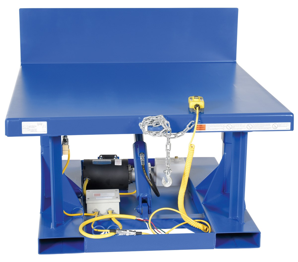Steel Efficiency Master Tilt Table 48 In. x 48 In. 2000 Lb. Capacity BlueThe efficiency master tilt table tilts pallets, crates, boxes, or baskets to facilitate easy container loading or unloading. The table features all welded steel construction for years of durability. The unique design minimizes pinch points to meet OSHA requirements. This tilt table is equipped with an industrial quality motor that delivers the best torque with minimal amperage draw for maximum life. Standard voltage is 460/3PH, with additional voltage options available. The tilt table has a standard push button hand control. Base includes fork pockets for portability with forklift.