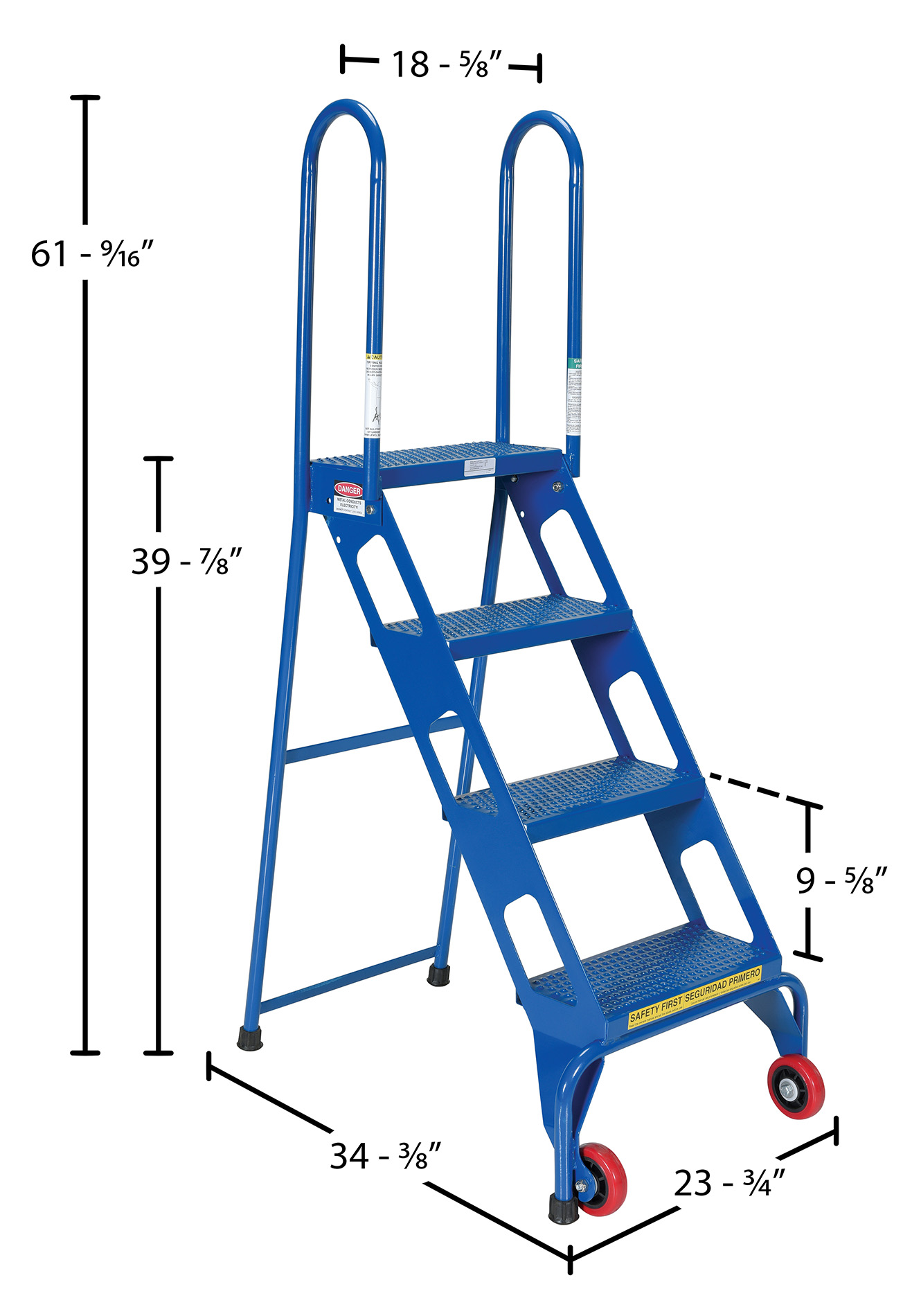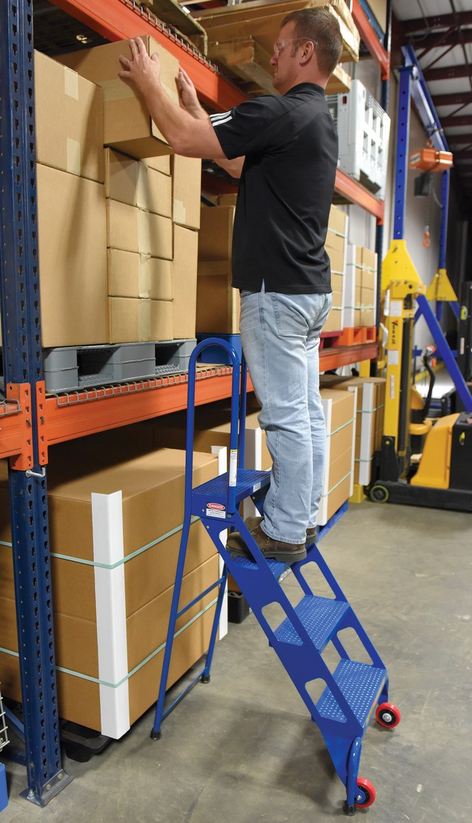 The folding ladder with wheels has a locking foldable design that saves on storage space when ladder is not in use. Ladder folds after unlocking spring-loaded detent pin. Once unit is folded, tilt back on wheels for easy portability. Ladder is carbon steel. The steps are perforated to provide a non-slip surface.