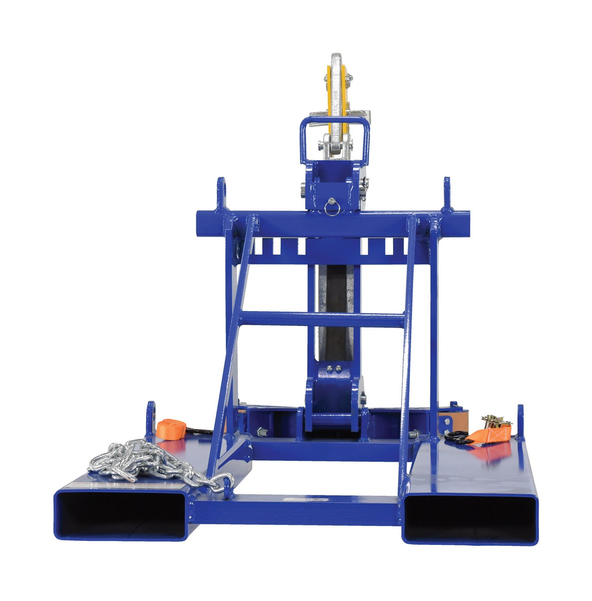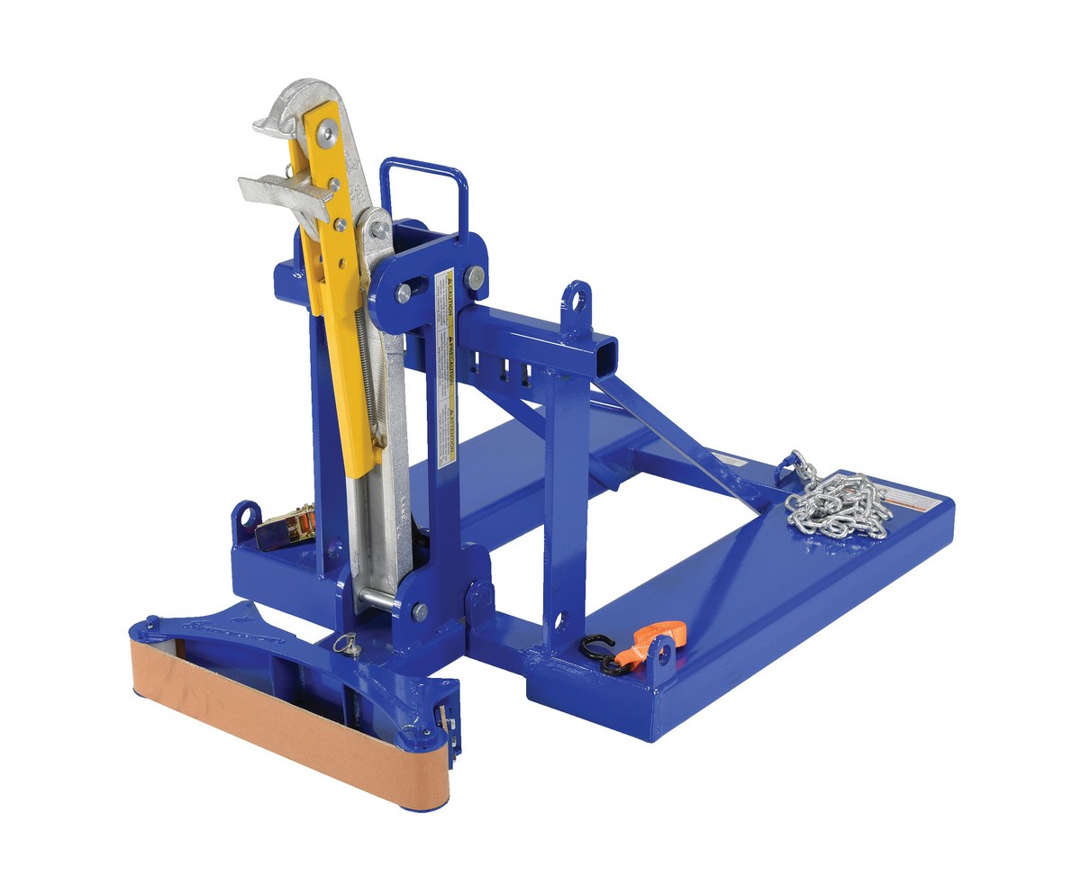 This time tested and proven design allows a fork truck operator to easily secure, move, and release drums without leaving the seat of the fork truck. For use with open (with lid installed and secured) and closed head steel, plastic, and fiber drums with a top lip strong enough to support the weight of the drum. Includes safety restraint to secure unit to the fork truck. Welded steel construction. Baked-in powder-coated toughness. A ratchet strap is supplied to secure the drum to the unit when traveling over rough terrain.