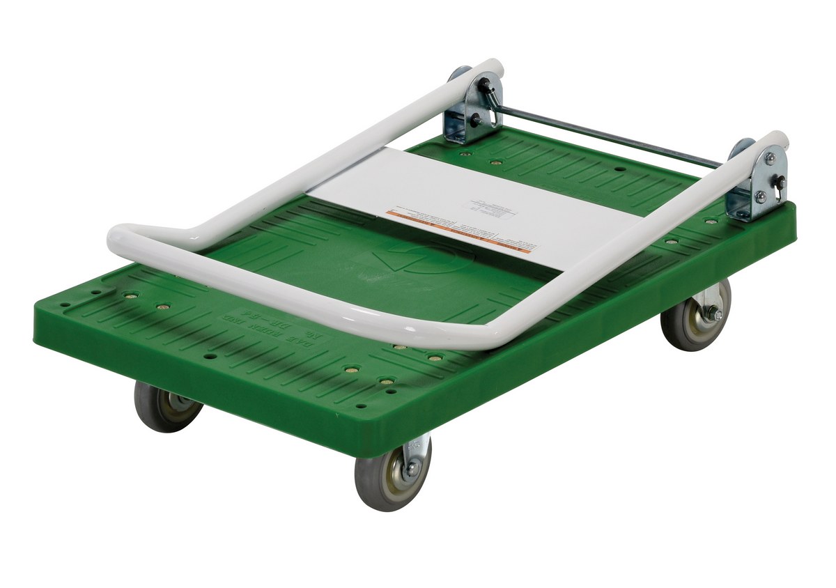 Plastic Platform Truck with fold down handle is tough, high impact-resistant plastic construction is virtually maintenance free. Industrial grade plastic deck will not rust, dent, chip, or discolor. A lip runs along the perimeter of the deck to help retain cargo. The steel handle folds down for storage. Truck rolls smoothly on casters.