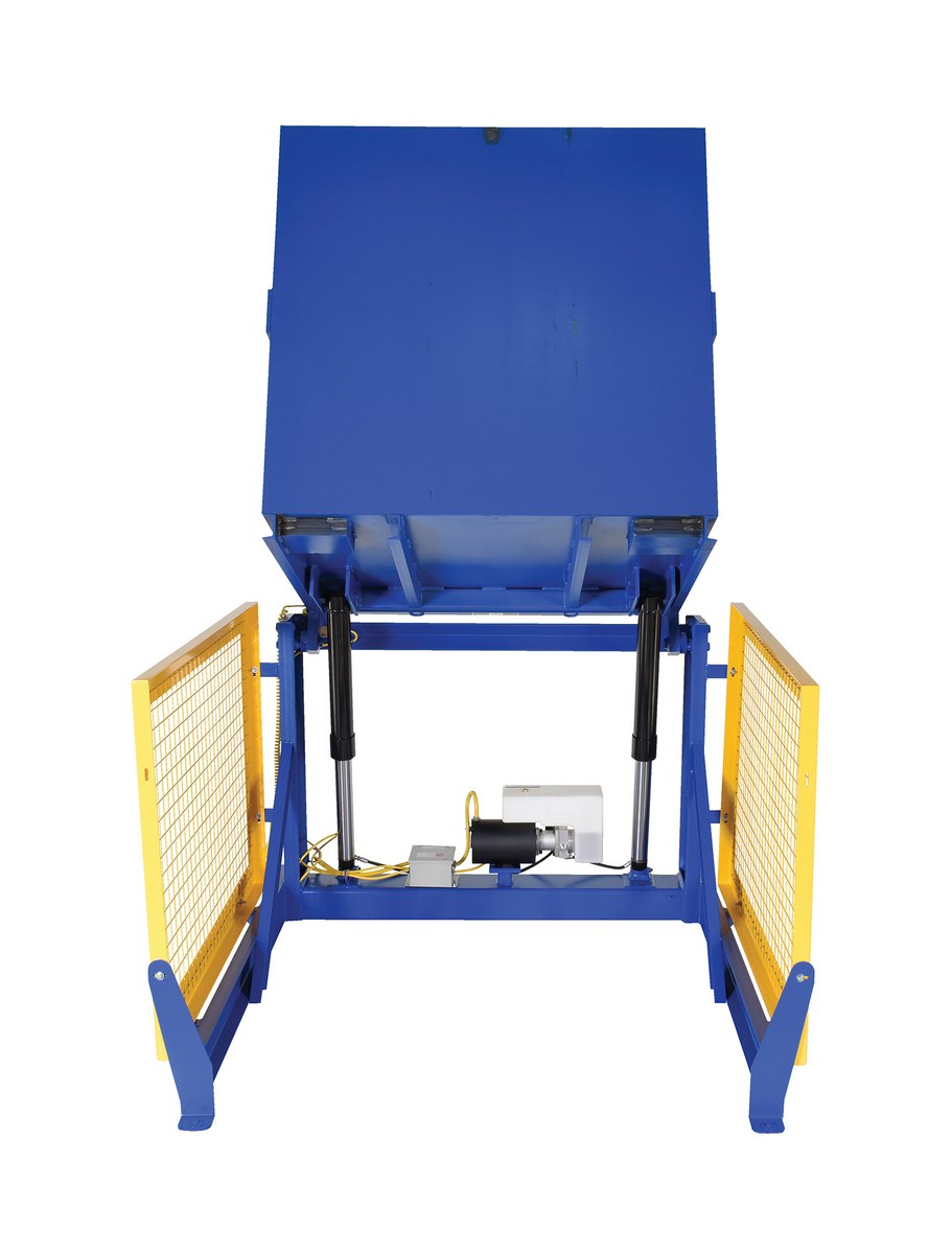 Steel Electric Hydraulic Box Dumper 36 In. Dump Height 4,000 Lb. Capacity BlueThe electric/Hydraulic box dumper is designed for controlled dumping of material from boxes, crates, and other types of containers. It is designed for pallet truck loading and unloading. The retaining bar adjusts to accommodate a wide range of container heights. Each dump height has a hold down range and an internal power unit with a hand held control standard. It has a heavy-duty welded steel construction with protective mesh side screens included.