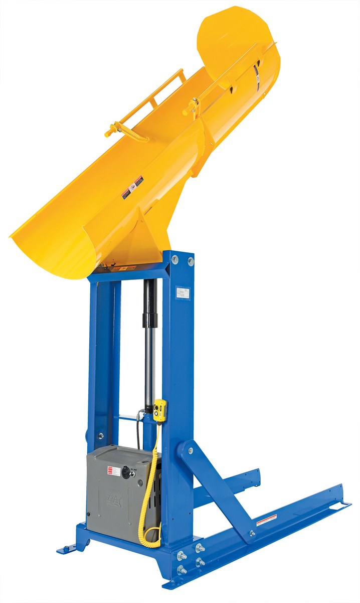 The Hydraulic drum dumper is what you need to dump heavy drums. Works with plastic, steel, and fiber drums. Dumper has a solid steel chute and all steel construction. Upper travel limit switch, emergency brass safety velocity fuse in cylinder, and vertical adjustment drum restraints are standard. Dumper is operated with a hand held control on a coil cord standard.