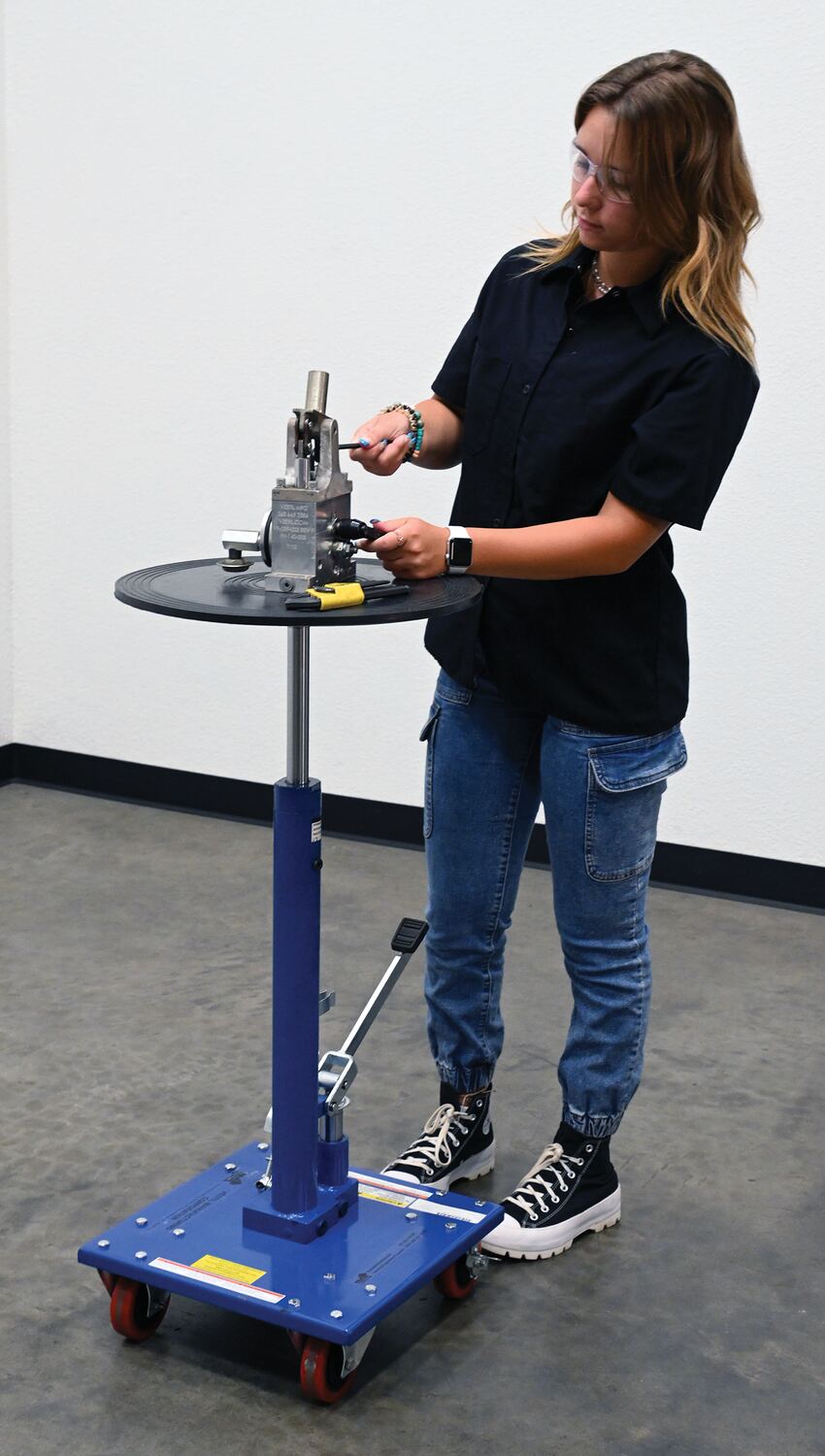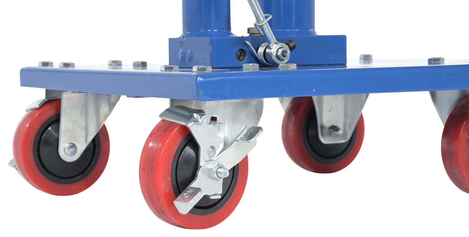 A hydraulic post table works well in a variety of environments from lifting dies and castings to moving machine parts. The adjustable height allows the user to match their preferences with the table top. The table rolls on two swivel and two rigid casters. Brakes are included on the casters to help maintain stability during the loading and unloading process. Post table is built of steel with a powder coated finish.