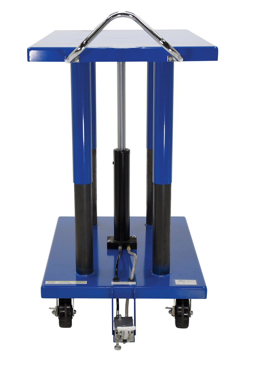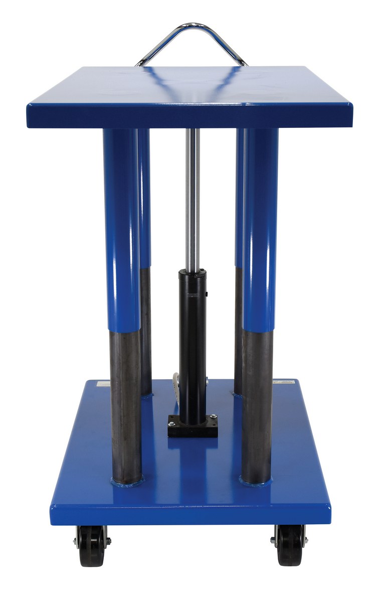Steel Hydraulic Post Table 32 In. x 48 In. 6,000 Lb. Capacity BlueThe Hydraulic post table is built for heavy-duty shop use. This post table is good for many material handling uses including: lifting dies and castings, moving machine parts, positioning welders work, leveling feed material for pump presses, conveyors and press brakes, and similar material handling jobs. The posts are telescoping to help stabilize and support loads during operation. Table includes four casters; two locking swivel with brakes and two rigid. The unit features a two-speed auto shifter for maximum operator convenience and safe platform lowering.