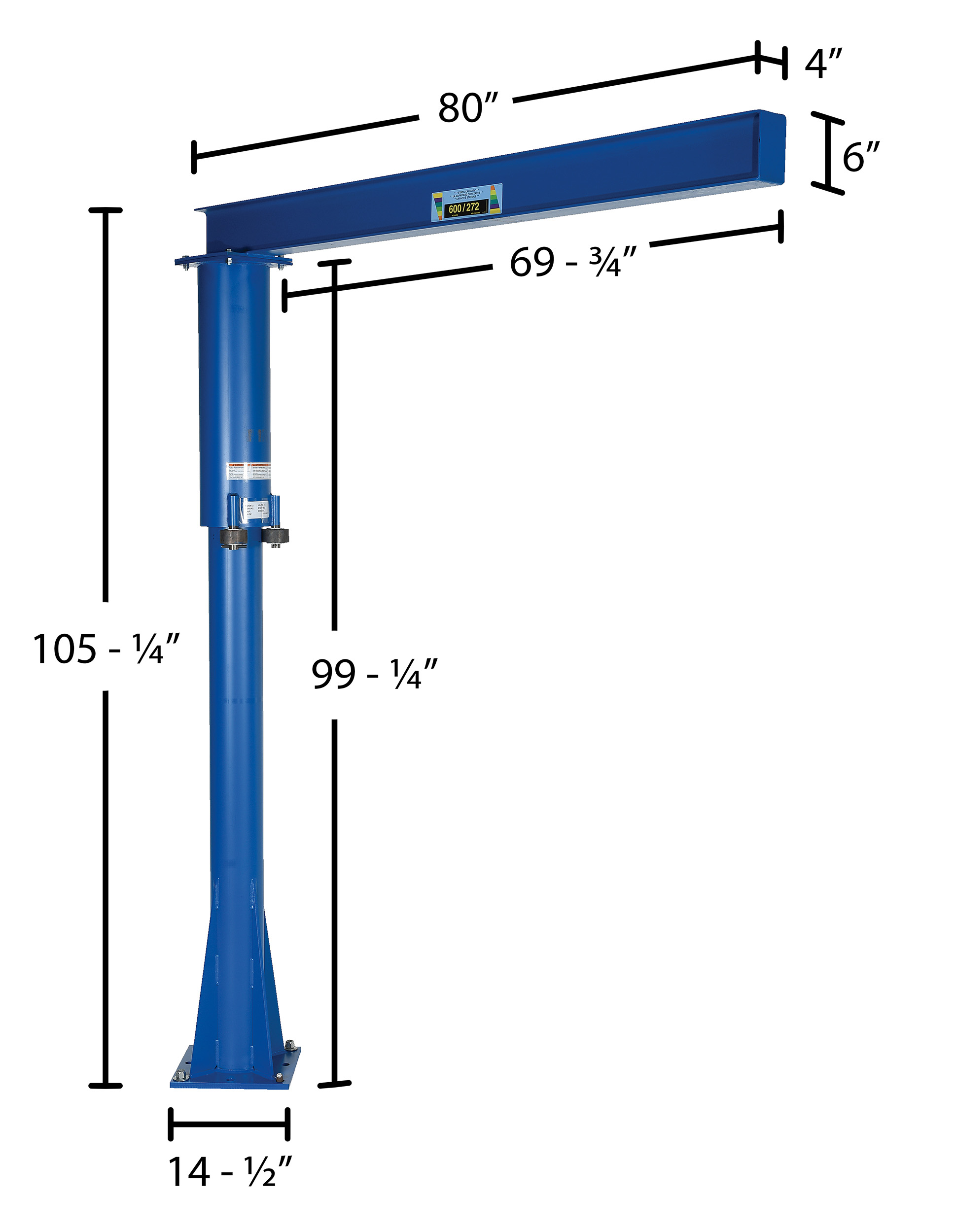 Steel Floor Mounted Jib 80 In. I-Beam 600 Lb. Capacity BlueThis floor mounted jib adapts well to a variety of applications. With the unique design, the jib is functional in any direction for complete customization of the work station. Solid steel construction will assist workers in lifting awkward material. Hoists & Trollies can be ordered separately.