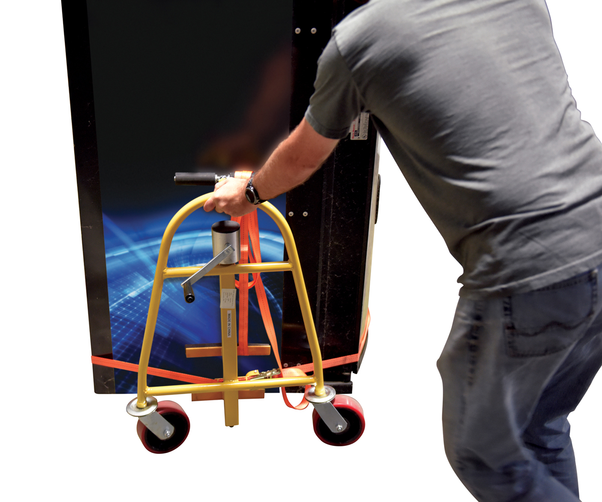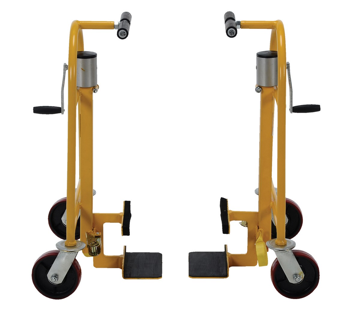 Steel Machinery/Vending Machine Lifts 15-1/2 In. x 29-1/4 In. x 31-1/8 In. 1300 Lb. Capacity YellowThese furniture, crate, and vending machine movers make the transport of furniture, crates, and machinery easy. Simply slide nose plate under item to be moved, strap both dollies together, and lift. Movers have a manual mechanical hand crank lift. Standard with swivel poly-on-steel casters and long straps. Priced and sold in pairs.