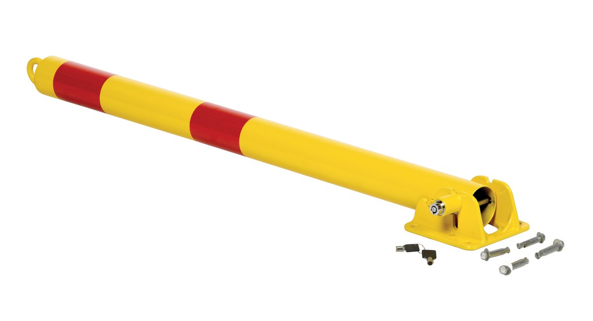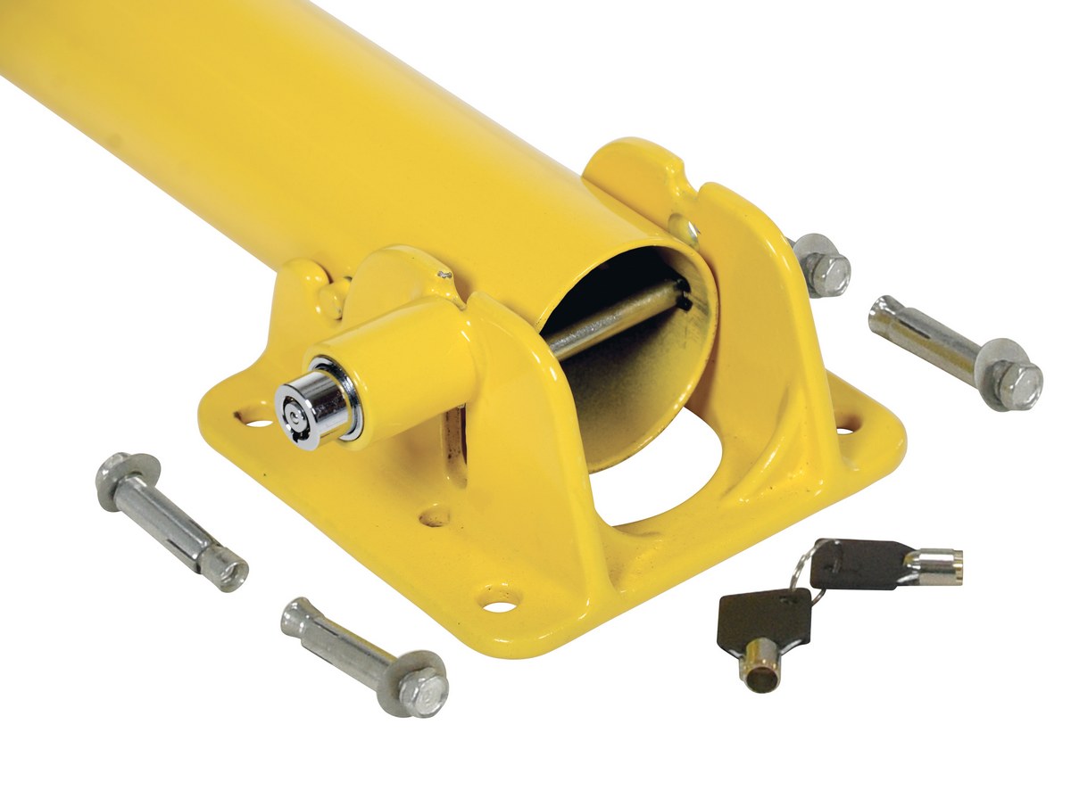 The fold-down bollards are ideal for industrial and distribution facilities. The heavy duty, stainless steel construction is durable and long lasting through the harshest of environments. Secures in open position via internal lock, two keys included, along with mounting hardware.