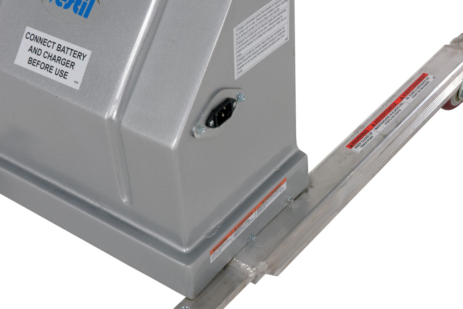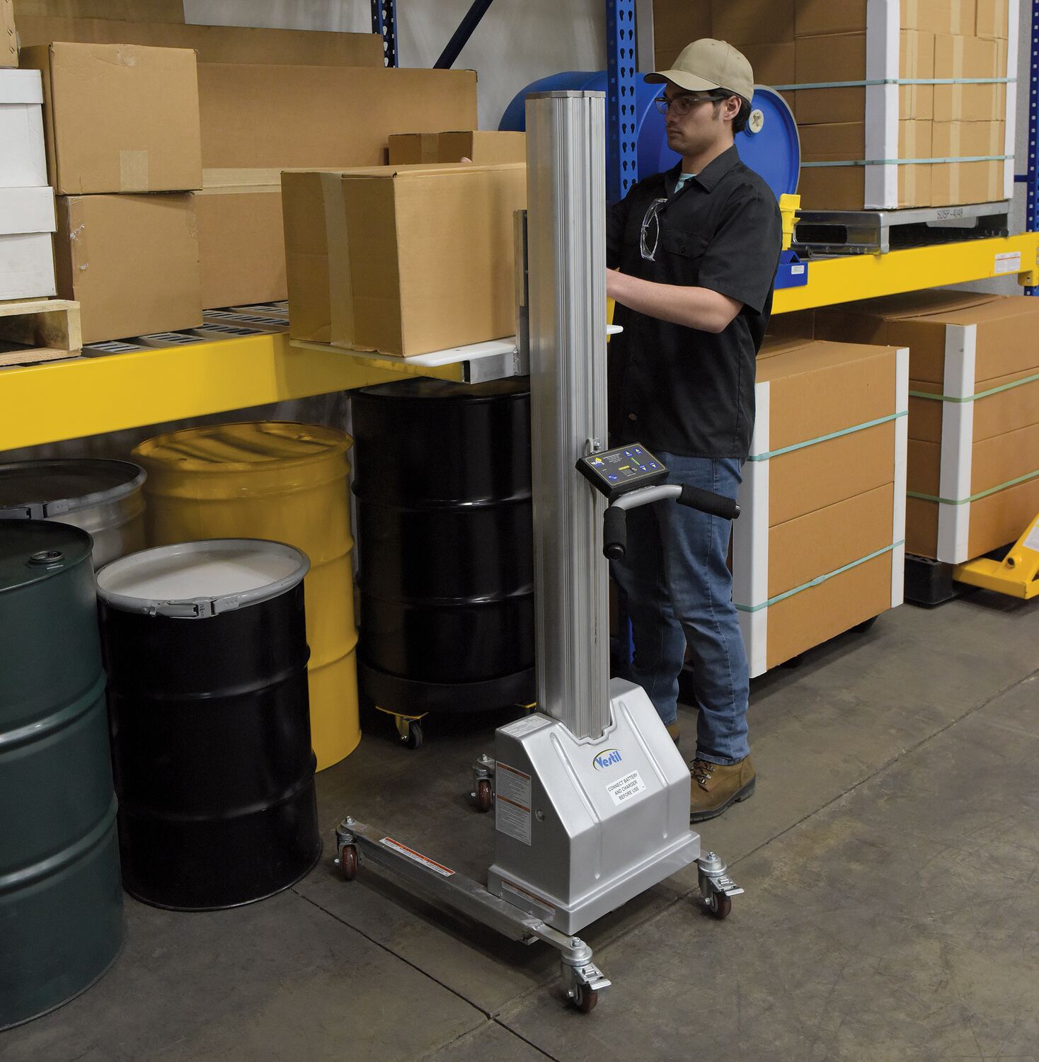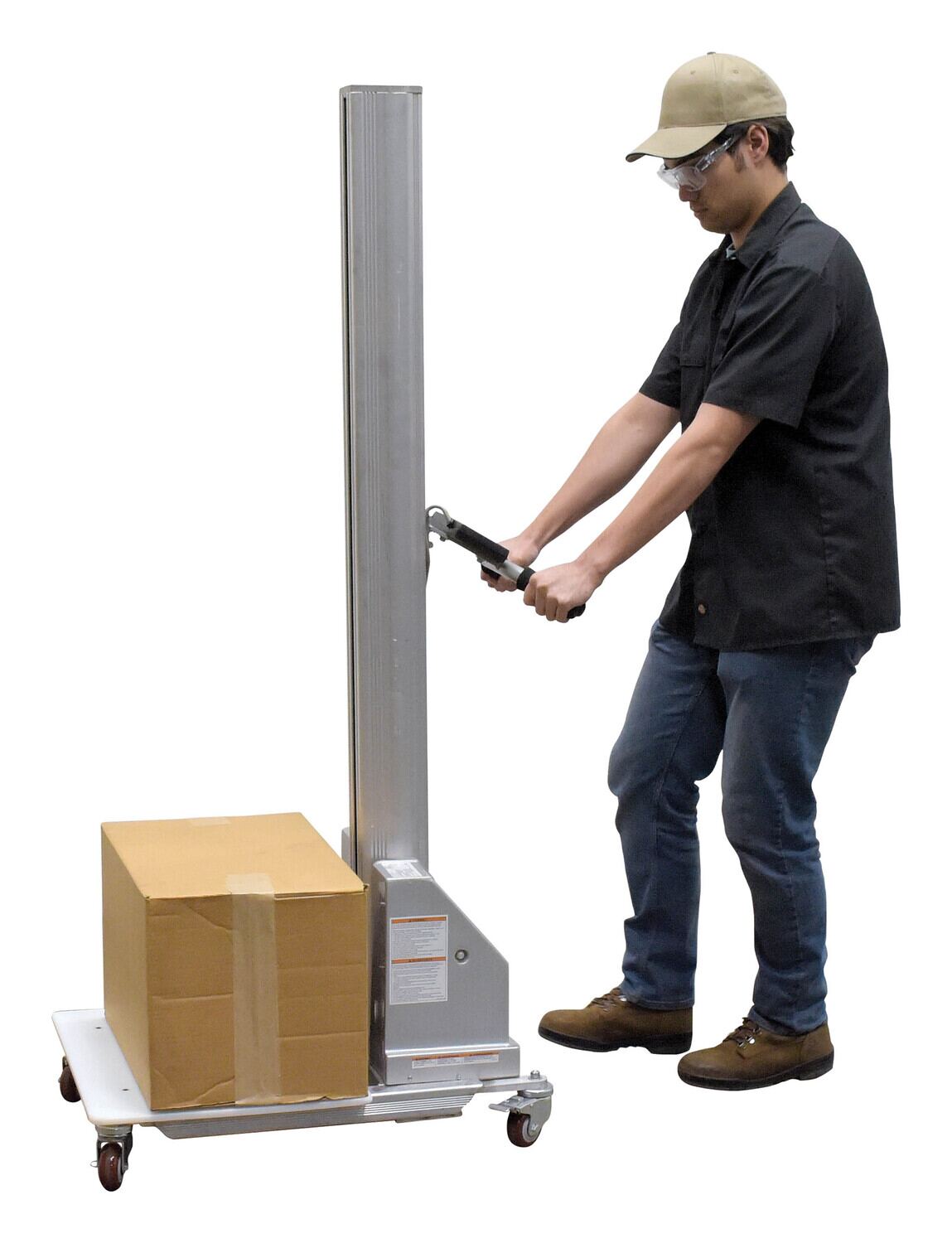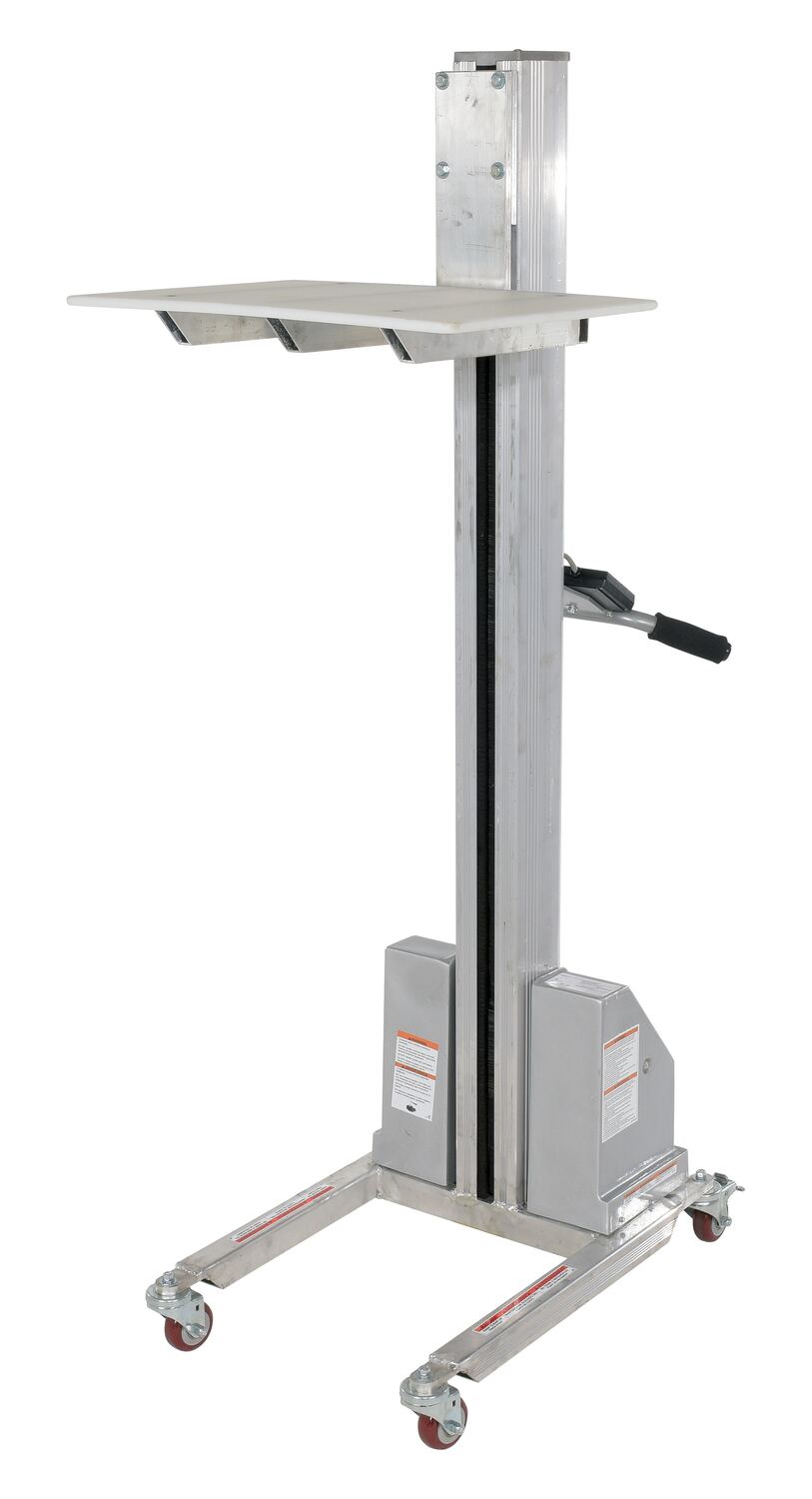 Aluminum Quick Lift DC Powered Lift 57 In. Raised Height 175 Lb. CapacityThe DC powered quick lift is a quiet, lightweight unit used for transport and positioning loads quickly with just the push of the button. The unit is battery operated with a high density polyethylene platform. It features a low profile design for maneuvering in narrow aisles and confined spaces. The poly casters consist of two swivel and two swivel-locking that are standard. The DC system runs with an AC on-board charger.