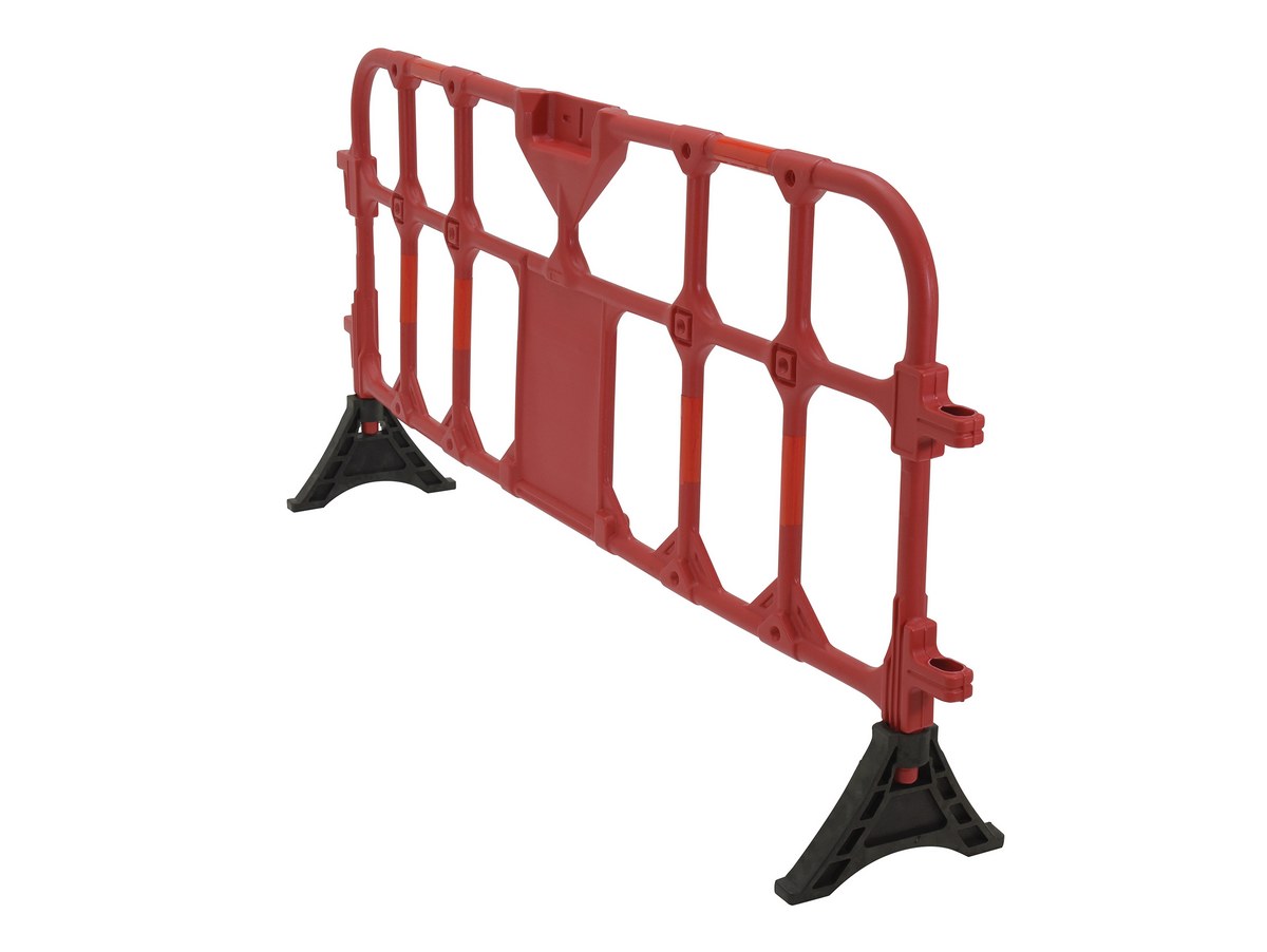 Plastic interlocking barriers will not rust and will retain attractive appearance. Reflective red tape provides better identification at night. Barrier ends include connectors for interlocking multiple units. The non-removable feet come pre-filled with sand for weight ballast. Feet can be rotated to allow for barriers to be stacked. Manufactured from hope material and includes UV stabilizer for longer life. Ships and stores assembled.