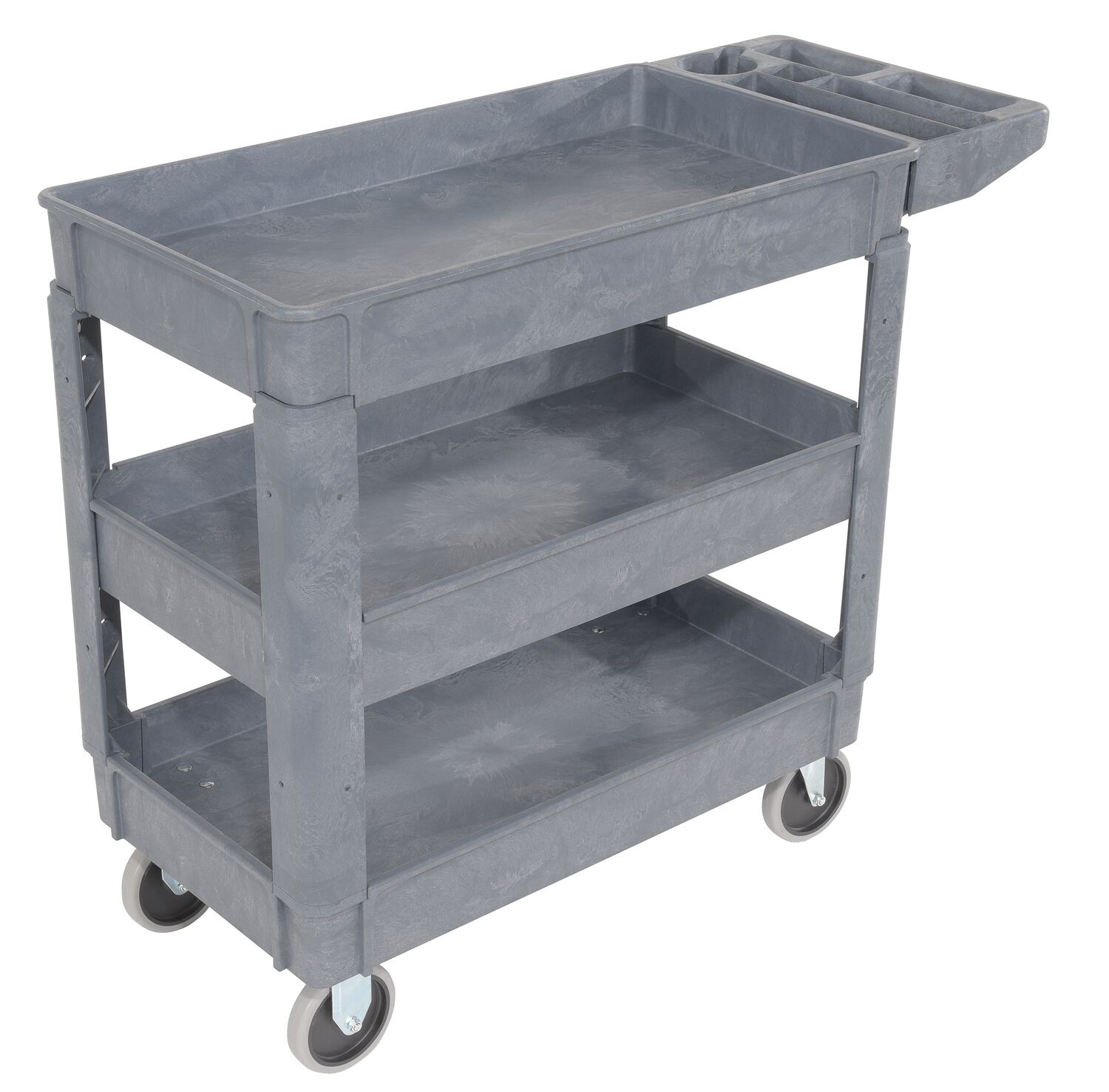 Plastic Utility Service Cart 3 Shelves 40 In. x 18-1/2 In. x 33-1/2 In. 550 Lb. Capacity GrayThis plastic utility service cart is constructed from durable yet lightweight structural foam plastic. Choose the three (3) shelf design to accommodate your application. Deep lips prevent parts from rolling off. Ideal for mail rooms, shipping docks, grocery stores, warehouses, and inventory rooms.