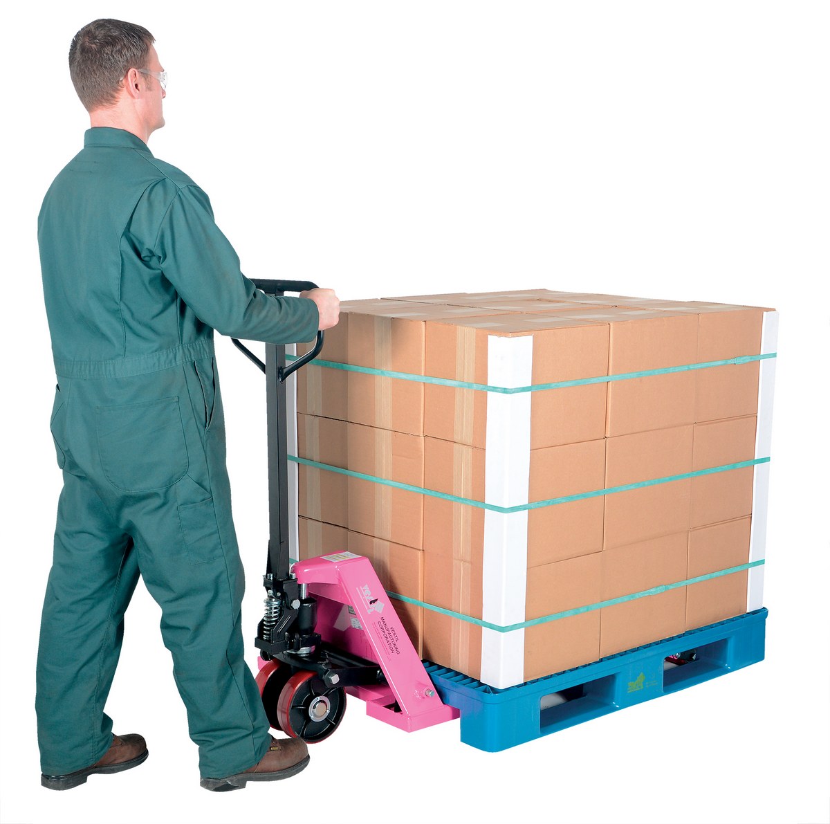 The full featured pallet truck is an economical way for one person to move heavy pallet loads without the use of a fork truck! Includes two (2) articulating steering wheels and two (2) front load rollers. The ergonomic design requires only seventy-five (75) pounds of pulling force when fully loaded. Steering wheels include bearing dust covers for added life. Nose wheels are located on the front edge of each fork to assist in clean pallet entrance and exit. Reinforced triple-formed steel forks provide twice the strength of standard single-formed forks. The unit is equipped with internally mounted solid steel adjustable push rods. The spring loaded handle automatically returns to vertical position when not in use. Hydraulic pump design facilitates easy-access seal replacement. Chrome-plated hydraulic pump piston for long seal life.