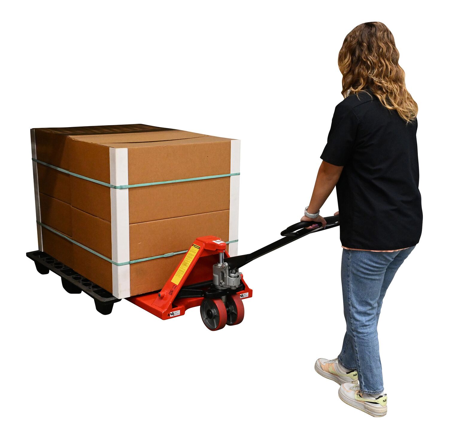 Steel Pegasolift Manual Pallet Truck 27 In. x 48 In. 5,500 Lb. Capacity RedThe full featured pallet truck is an economical way for one person to move heavy pallet loads without the use of a fork truck! Includes two (2) articulating steering wheels and two (2) front load rollers. Nose wheels are located on the front edge of each fork to assist in clean pallet entrance and exit. The unit is equipped with internally mounted solid steel adjustable push rods. A chrome-plated hydraulic pump piston supports long seal life, while the hydraulic pump design facilitates simple seal replacement when needed.