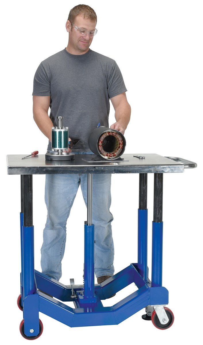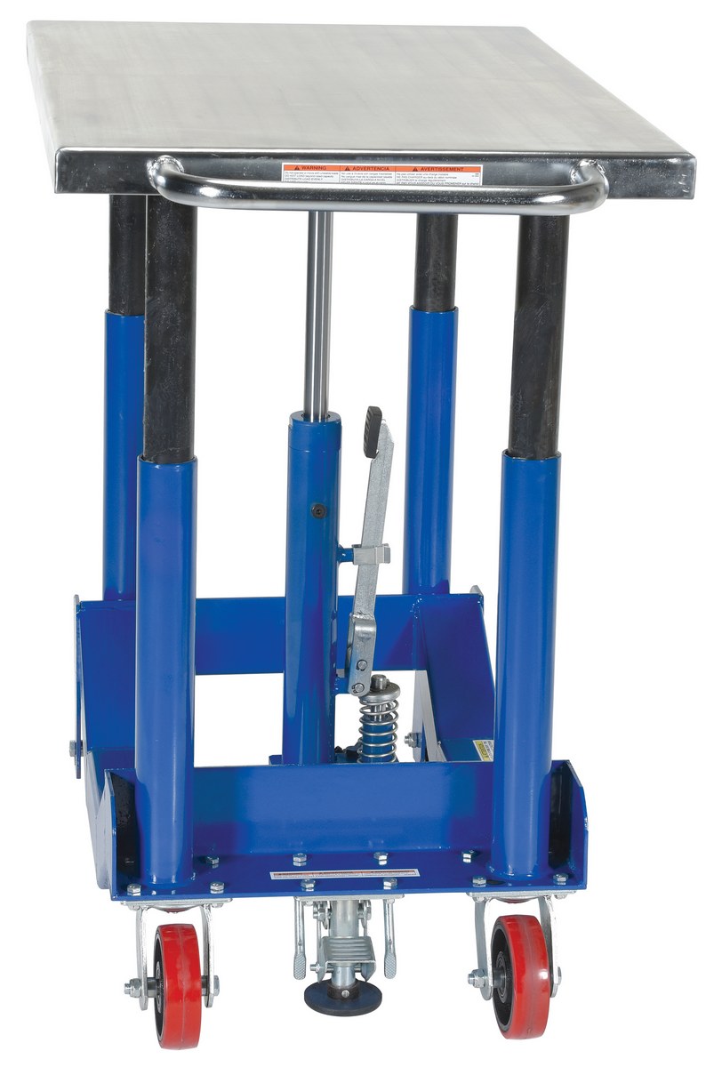 Steel Low Profile Post Lift Table 41 In. x 24 In. x 25 In. 4000 Lb. Capacity BlueHydraulic post tables are ideal in material handling facilities. The unit can be of use in a variety of environments from lifting dies and castings to moving machine parts. The corner posts are telescoping to help stabilize and fully support the load during operation. The tables roll smoothly on two (2) locking swivel casters with brakes and two (2) rigid. The tables can be lifted/lowered with a single speed foot pump, two-speed foot pump, two speed auto shifter that automatically shifts when the table is loaded, or linear actuated power.