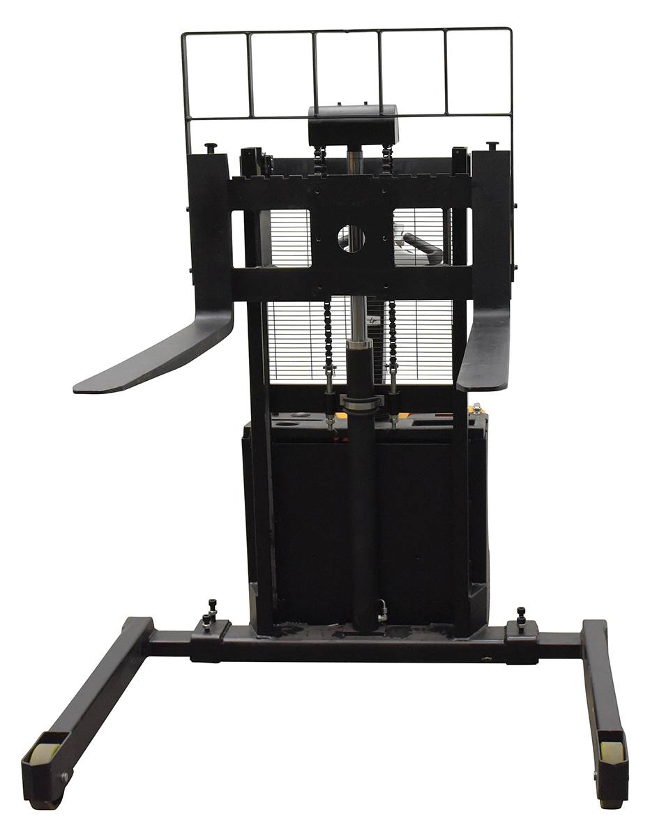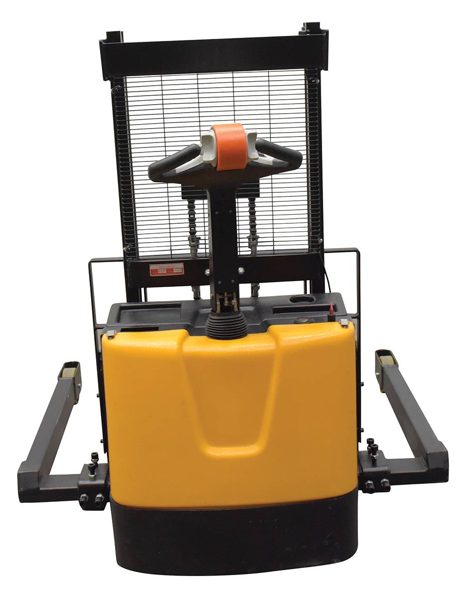 Steel Adjustable Double Mast Stacker 43 In. Raised Height 3,000 Lb. Capacity Black / YellowA fully powered electric stacker transports loads throughout warehouse facilities quickly and with ease. Ergonomic handle features lift/lower controls, adjustable forks/adjustable legs and horn Stackers can be easily maneuvered in condensed areas where space is limited. Steel construction with a powder coated for built in toughness. Horn included.