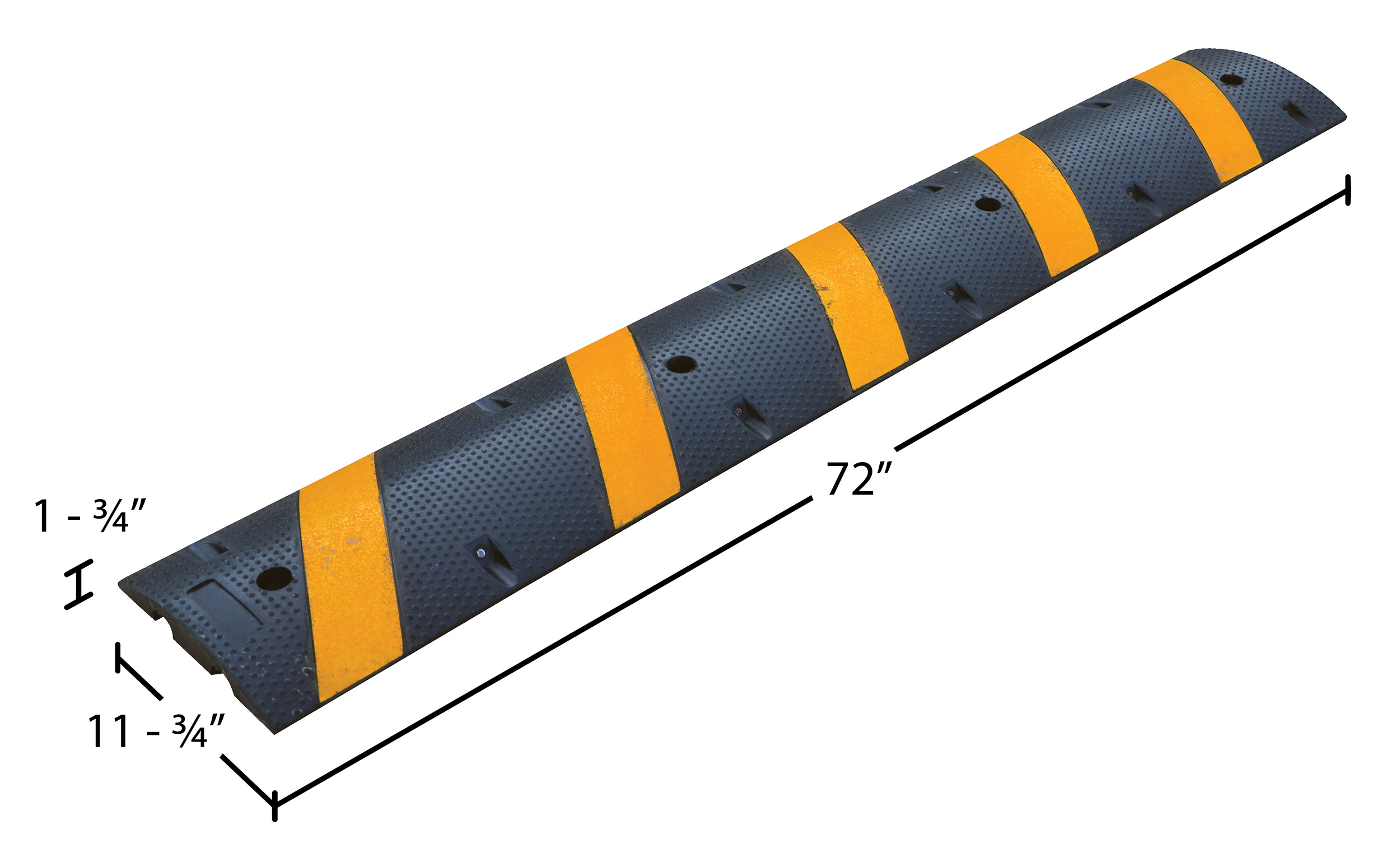 Rubber Heavy Duty Speed Bump 72 In. Length Asphalt 40,000 Lb. Capacity BlackThe molded rubber speed bump is ideal for warning drivers in parking areas and warehouses. Featuring reflective diagonal stripes and "cats eyes" for visibility, a heavy-duty molded rubber construction for durability, and pre drilled installation holes. Mounting hardware included. Optional end caps available upon request.