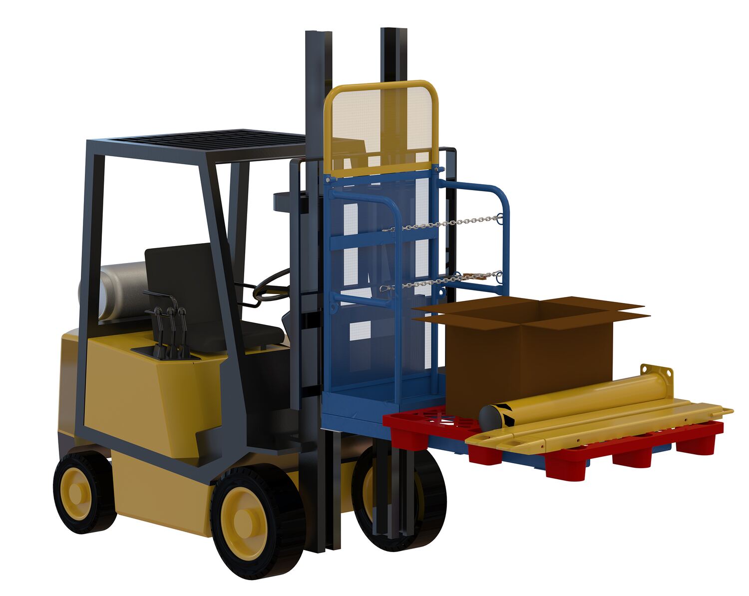 Elevate personnel and pallets to overhead racks and shelving for safe and convenient access with a stock picker work platform. Accommodates one (1) person and a pallet. Attaches to fork truck by inserting forks into fork pockets and securing platform to fork truck. Pin style tine lock standard. Dual handrails on two (2) sides. High expanded metal backing on fourth side. Includes checker floor plate platform and long safety restraint with hook to attach platform to fork truck.