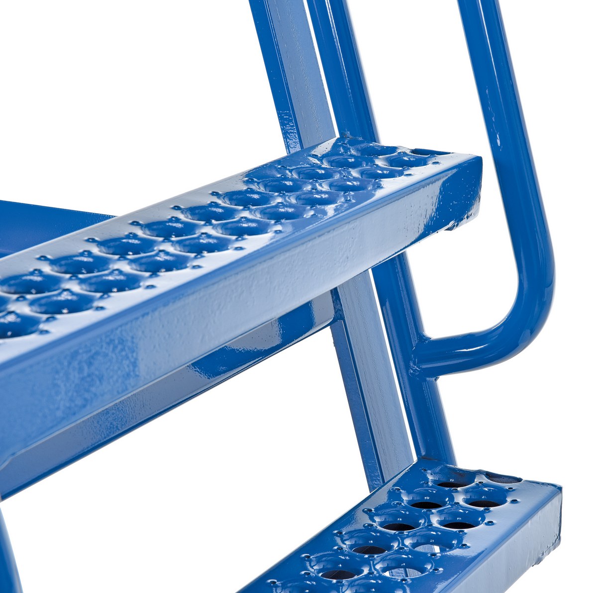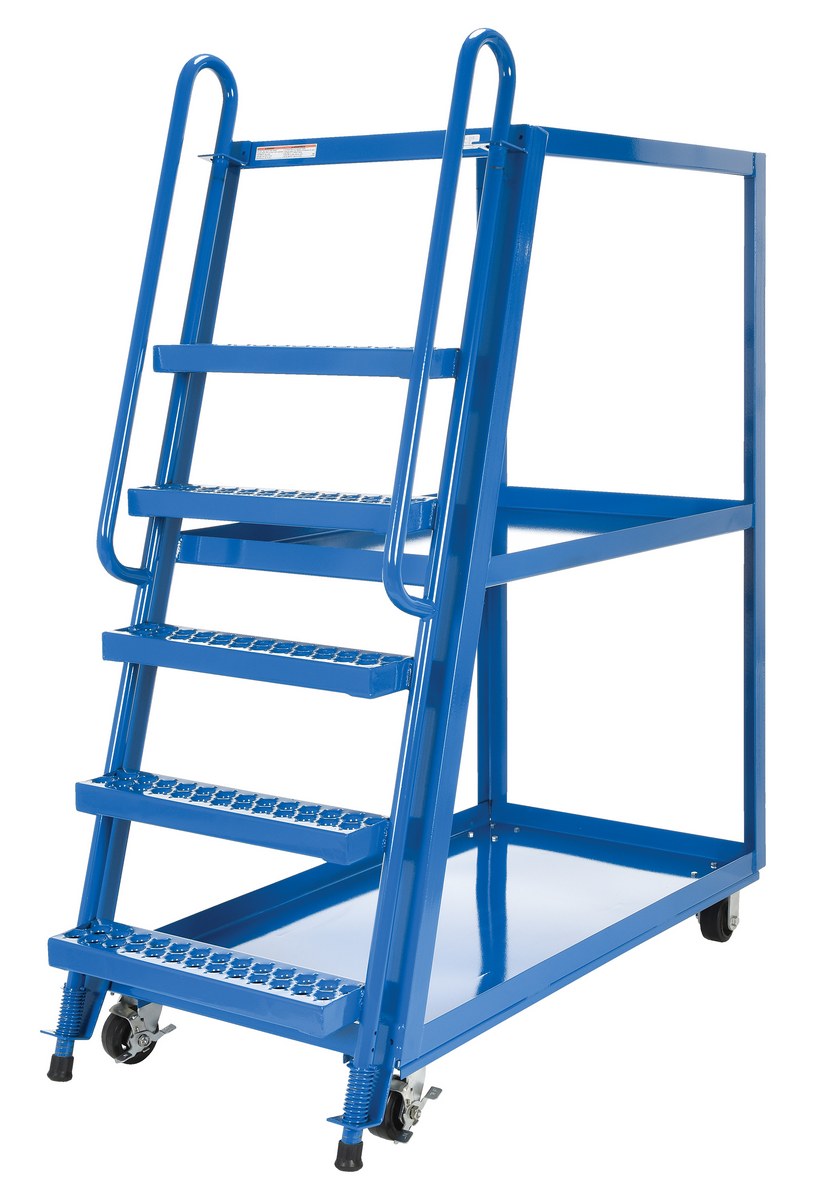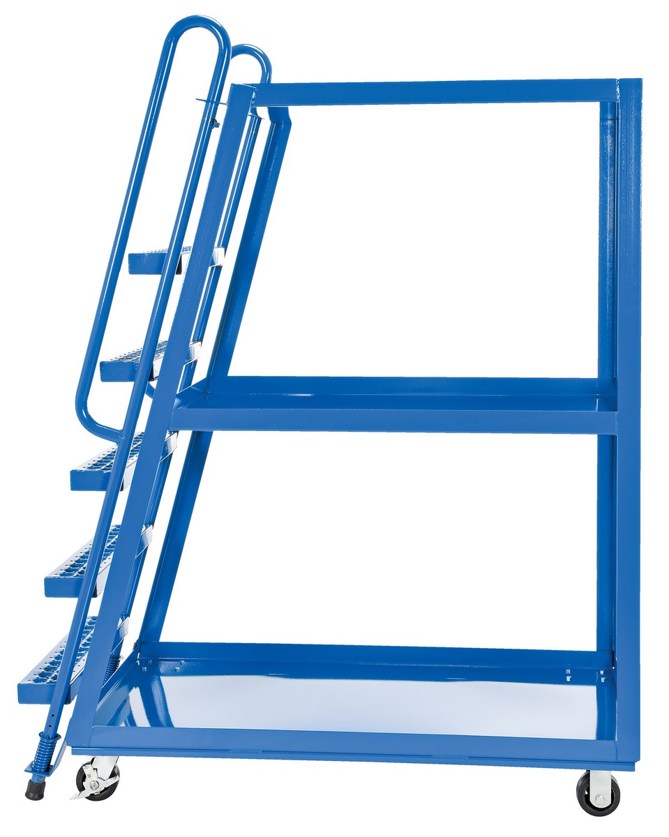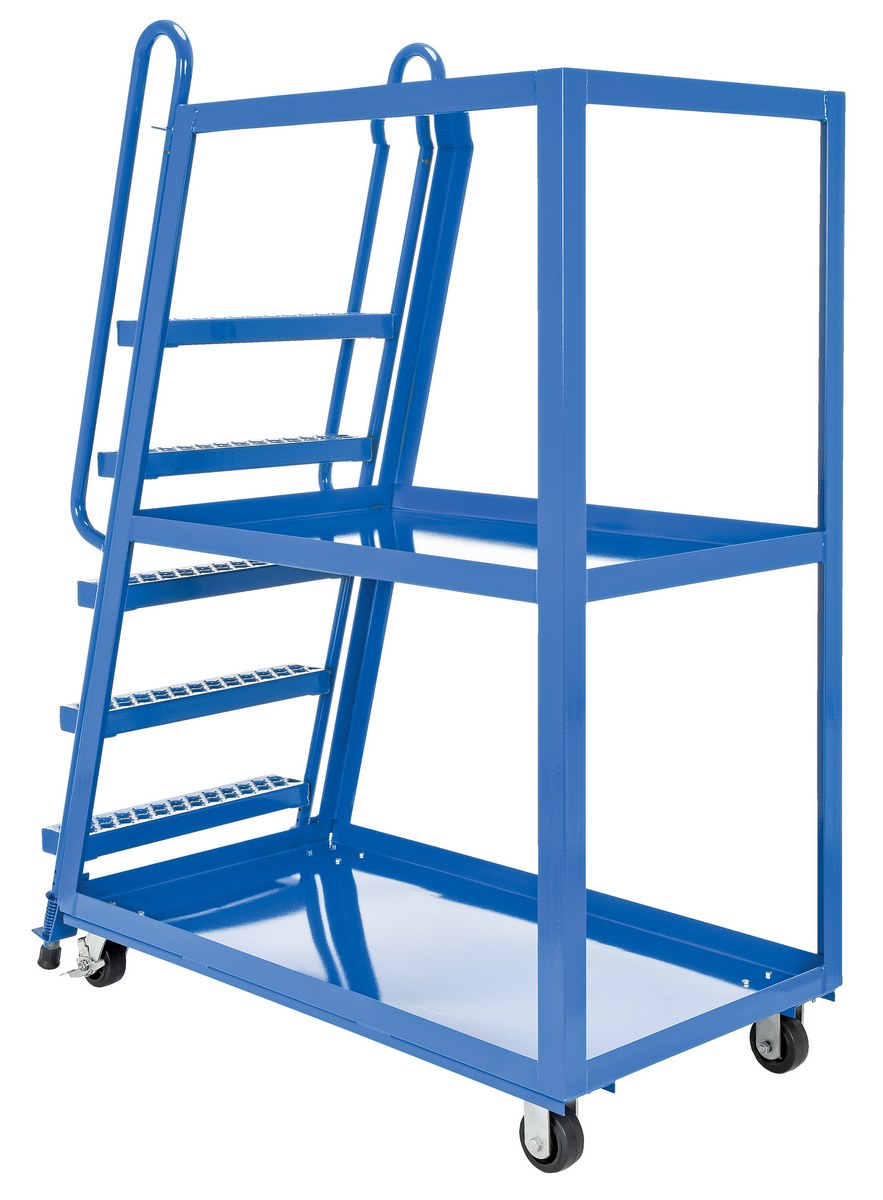 This oversized hi-frame stock picker truck is perfect for large jobs. Ideal for oversized cartons, boxes, parts, and supplies. A spring loaded steel ladder for sure, safe climbing, and loading. Steps have non-skid footing with self-cleaning surface. This stock picker truck has three (3) shelves. Built of durable steel construction. This unit is powder coated a blue finish.
