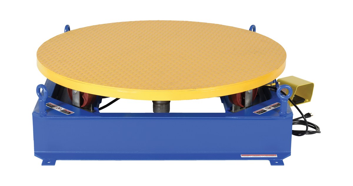 Steel Electric Hydraulic Stand Alone Powered Carousel 4,000 Lb. Capacity Blue / YellowThe stand alone powered carousel easily rotates pallets, skids, and other large objects with this rugged powered carousel. This carousel includes a round tread plate turntable that is supported with inverted casters for use as bearings. Also included; turntable, base, power unit, and fixed-speed control. Unit has a heavy-duty steel construction.