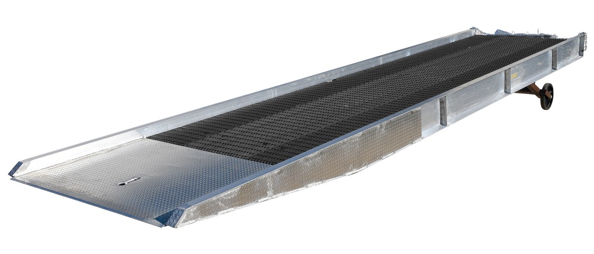 The portable Aluminum Yard Ramp with steel grating has a unique design that allows one person to position the ramp, adjust its service height, and load or unload trailers from ground level. It includes hand pump hydraulic lift, safety pressure relief valve, anchor chains, and tow bar pocket.