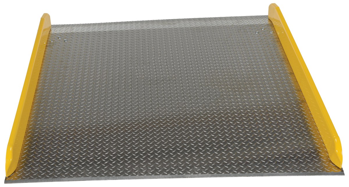 Aluminum Dock Board Steel Curb 60 In. x 72 In. 10,000 Lb. Capacity SilverThe Aluminum truck dock board with steel safety curbs is designed for portability and safety. The deck is made of tough high strength aluminum tread plate. The edges are beveled for smooth entry and exit. Safety curbs are coated yellow and are constructed of steel with cast tapered ends. Steel legs are bolted on for increased durability. Canted locking legs for easier truck portability. Manufactured in compliance with OSHA. The capacity is based upon the heaviest type of equipment used plus the maximum load carried times the single axle rating of total load. Dynamic loading, driver tendencies, speed and frequency of use must be considered. When using three-wheeled fork trucks order dock board with capacity at least four-times the lifting capacity of fork truck. The width of the dock board should be at least fifteen (15) inches wider than the load or equipment passing between the curbs. If the load does not pass between curbs, but is elevated above, add fifteen (15) inches to overall width of equipment.