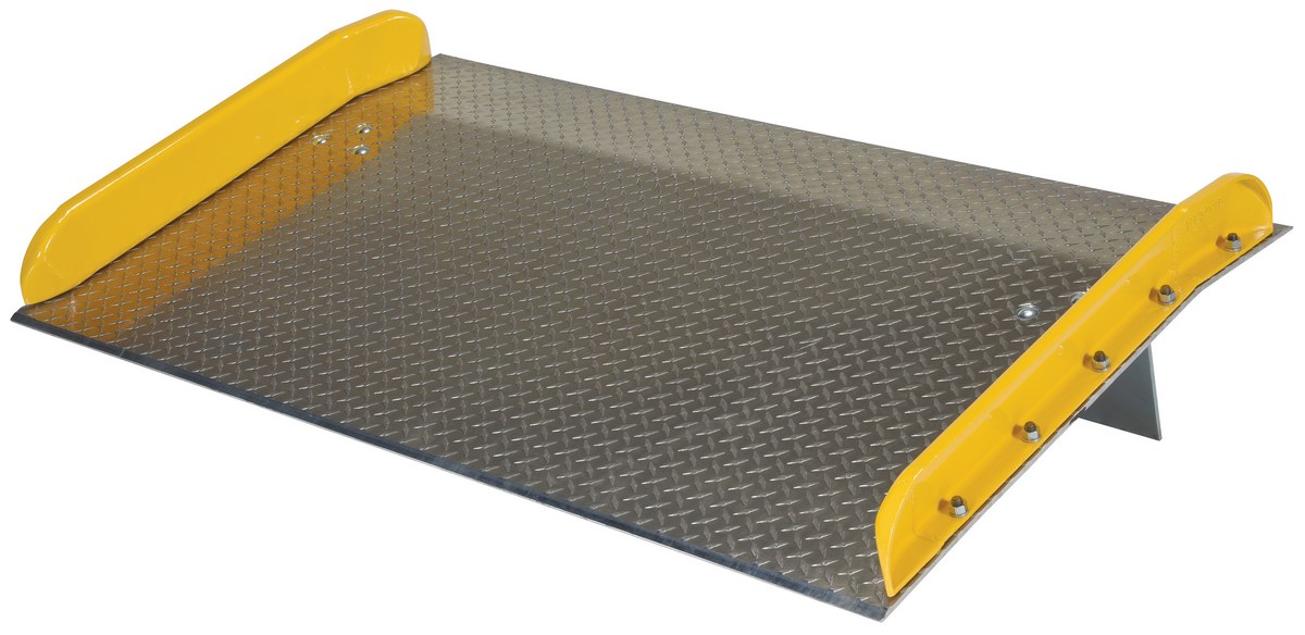 Aluminum Dock Board Steel Curb 60 In. x 36 In. 20,000 Lb. Capacity SilverThe Aluminum truck dock board with steel safety curbs is designed for portability and safety. The deck is made of tough high strength aluminum tread plate. The edges are beveled for smooth entry and exit. Safety curbs are coated yellow and are constructed of steel with cast tapered ends. Steel legs are bolted on for increased durability. Canted locking legs for easier truck portability. Manufactured in compliance with OSHA. The capacity is based upon the heaviest type of equipment used plus the maximum load carried times the single axle rating of total load. Dynamic loading, driver tendencies, speed and frequency of use must be considered. When using three-wheeled fork trucks order dock board with capacity at least four-times the lifting capacity of fork truck. The width of the dock board should be at least fifteen (15) inches wider than the load or equipment passing between the curbs. If the load does not pass between curbs, but is elevated above, add fifteen (15) inches to overall width of equipment.
