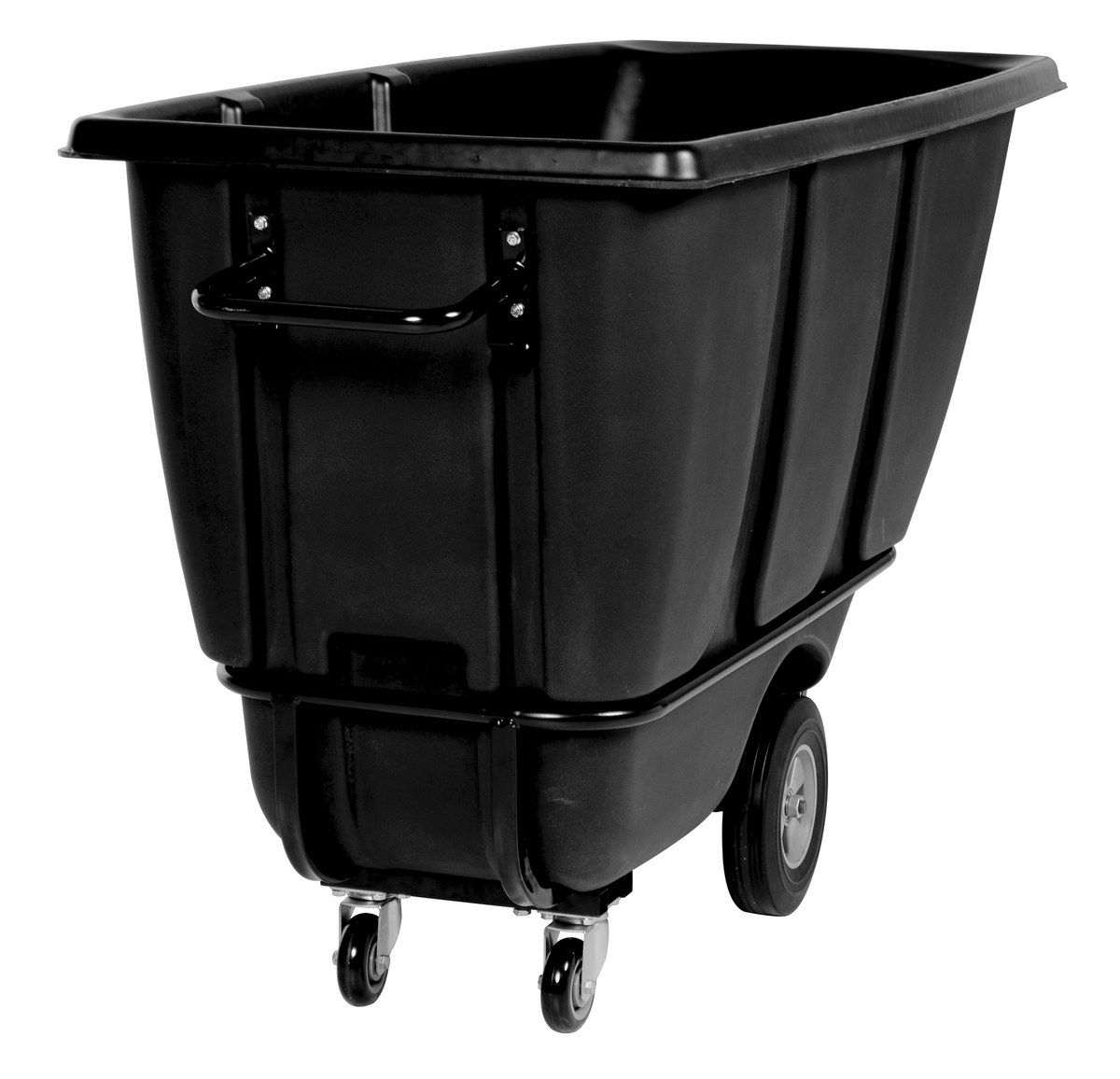 Durable plastic construction allows for collecting waste from multiple bins at a collective time. Great for warehouses, fairs, ball parks, schools, etc. Strong, one-piece molded polyethylene body with steel base tip support and a balanced design to allow for simple dumping by one person. Easily portable on 2 large rubber wheels and two swivel wheels. Not for use with fork trucks. Black color design.