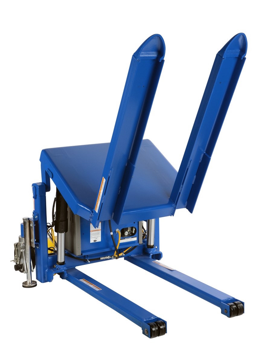 Steel Tilt Master DC Powered Foot Control 12 Volt 2,000 Lb. Capacity BlueThe tilt master lifts and positions filled tote boxes or baskets without the need of a fork truck or lift table using the newly designed heavy-duty tilt master. The tilter will function as transporters by moving completed products from work station to work station without waiting for a fork truck. This lift has a thin profile to allow the user to get as close to the load as possible, has a standard floor lock and rolls easily on the phenolic steering wheels. It is designed to be used with open bottom pallets or skids. The unit is powered by an electric DC motor that includes an on-board battery charger, battery charge indicator gauge and foot control.