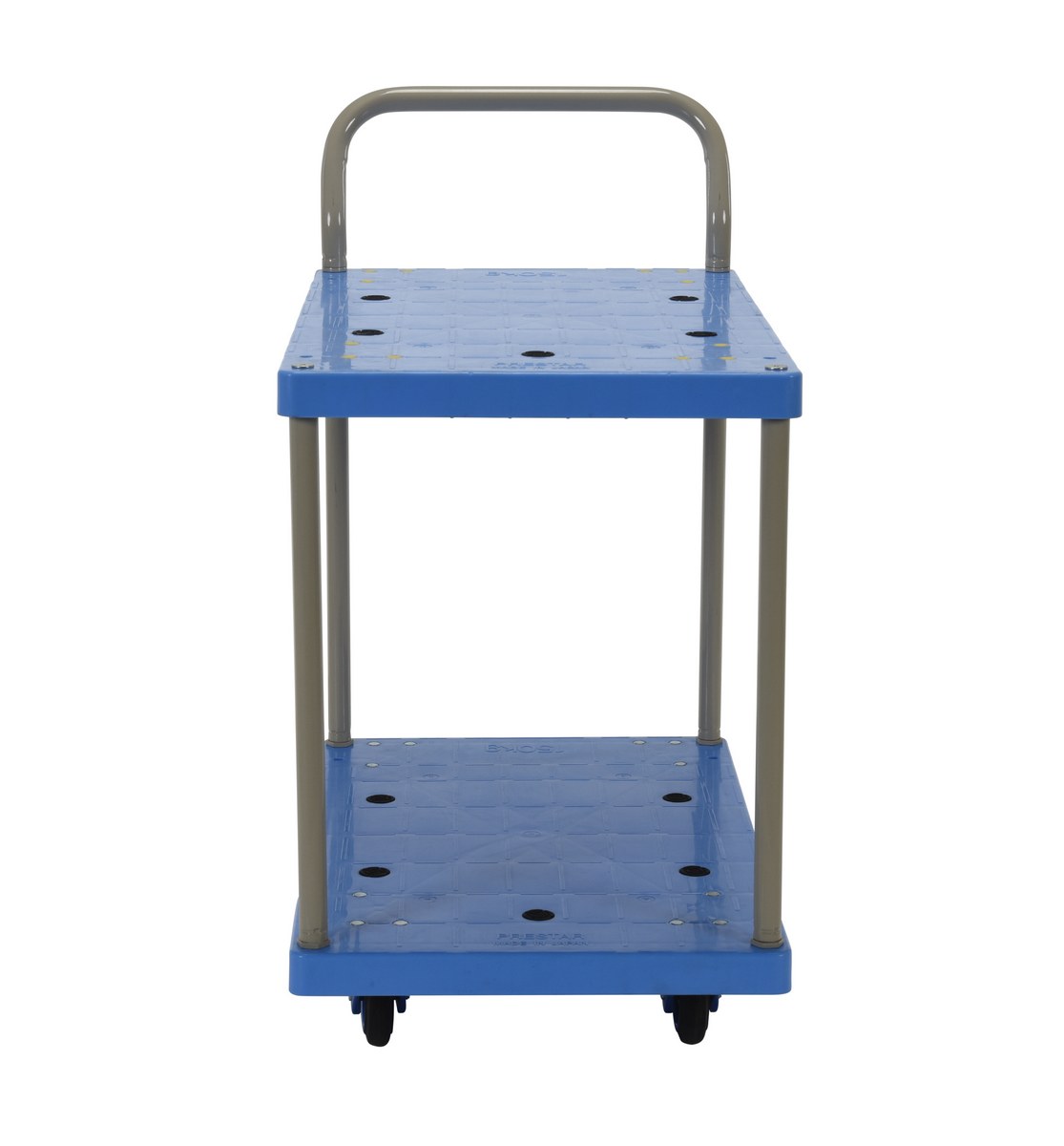 The plastic platform cart is a great addition to the shipping and distributing facilities. The double deck plastic platform creates a durable, yet lightweight construction that can be transferred simply from workstation to workstation. The unit rolls on casters for smooth transference over a variety of terrains, while the brake keeps the unit steady when not in progress. The attached handle creates a more ergonomic posture of personnel during use.