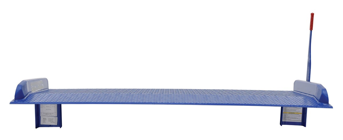 Steel Truck Dock Board 72 In. x 36 In. 10,000 Lb. Capacity BlueThe steel truck dock board is constructed of high strength (55,000 psi) steel for long life. Deck is diamond plated for safe, efficient use. Locking legs minimize ramp movement and are uneven to allow the dock board to sit canted for easier floor pickup by fork trucks when not in use. Standard with lever lift for quick portability with fork truck. Legs are located 12" from the edge of the dock board. Manufactured in compliance with OSHA. Optional accessories: lifting chains, span locks, span pins/holes and removable pickup loops.