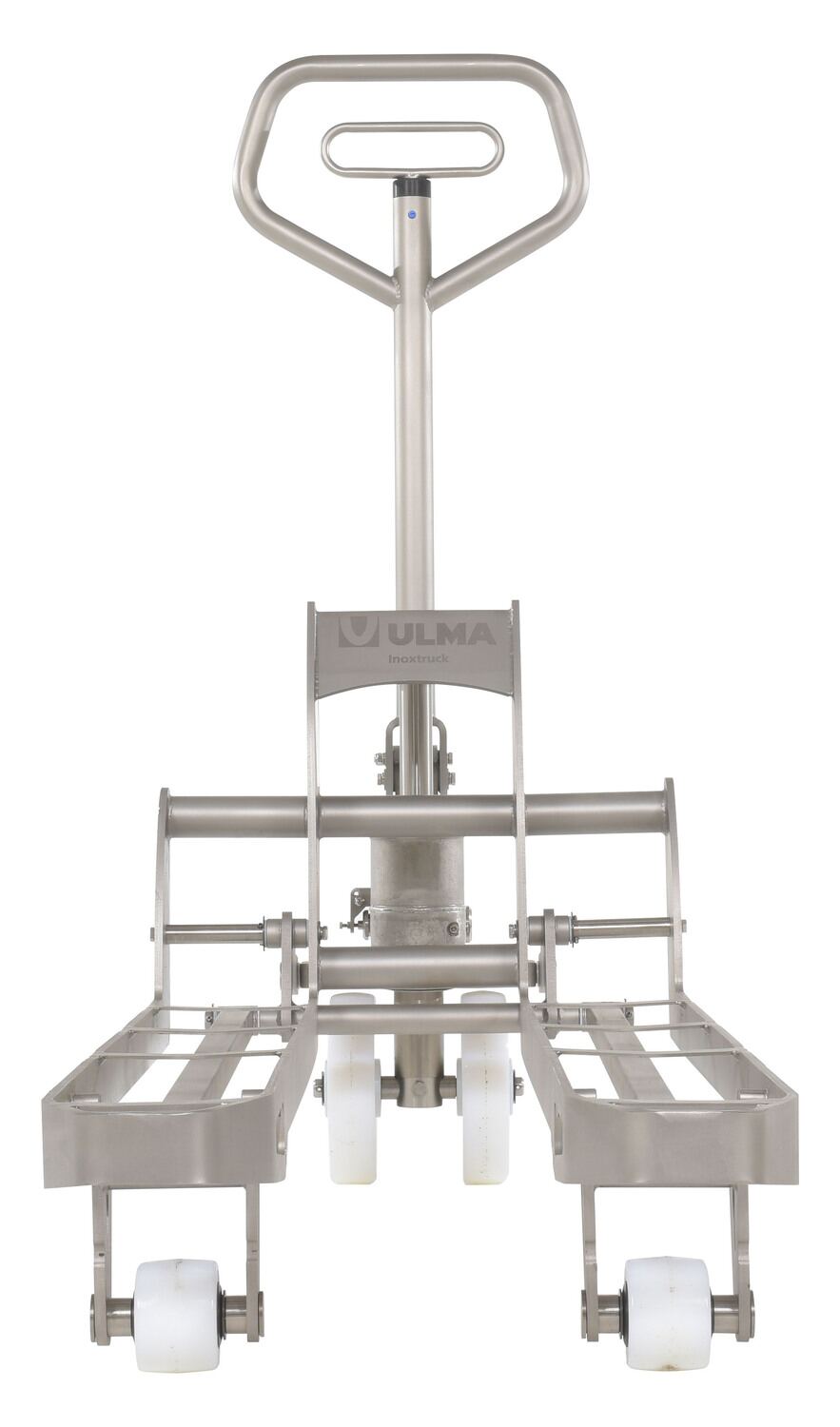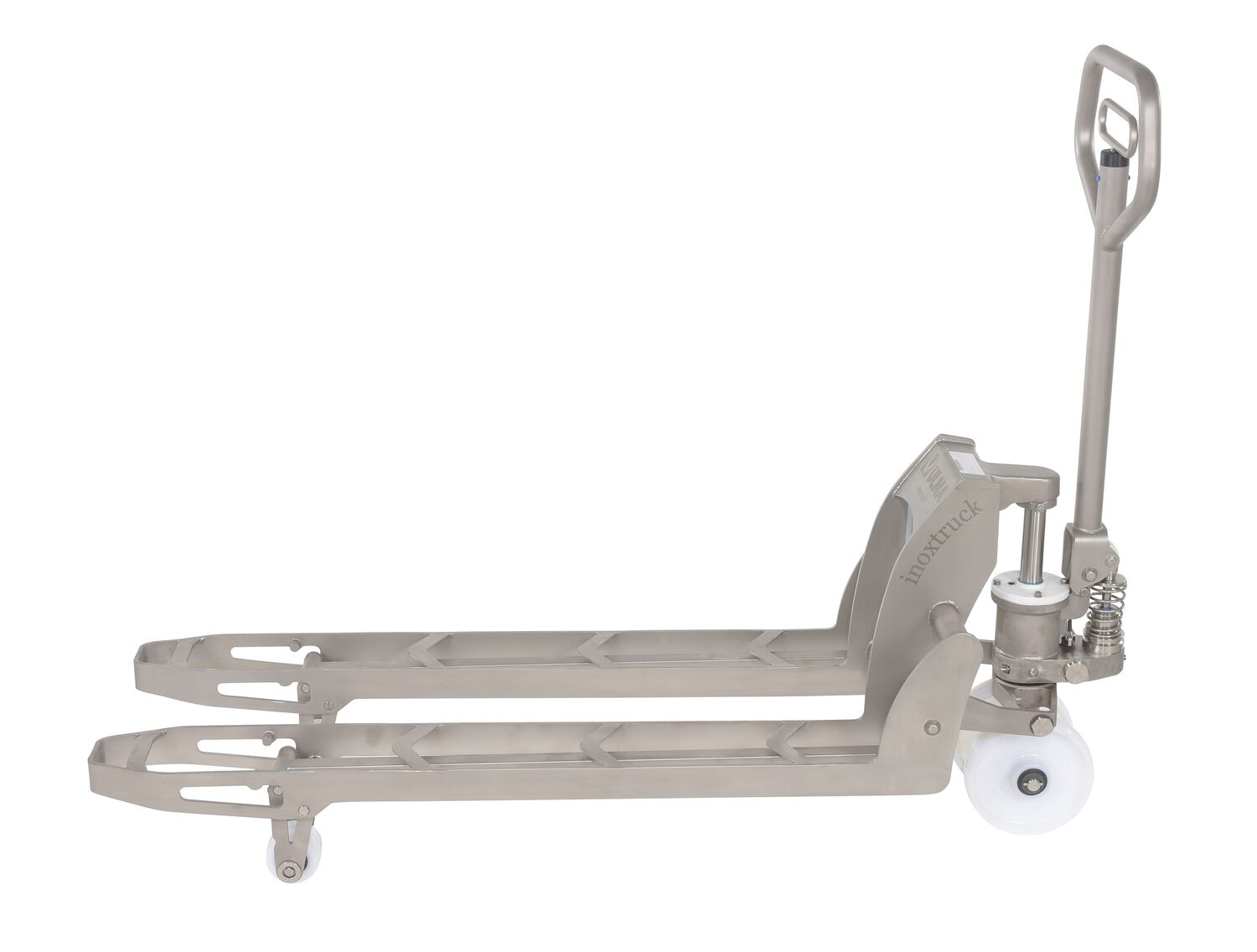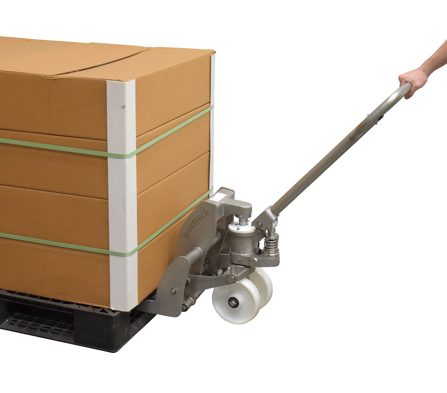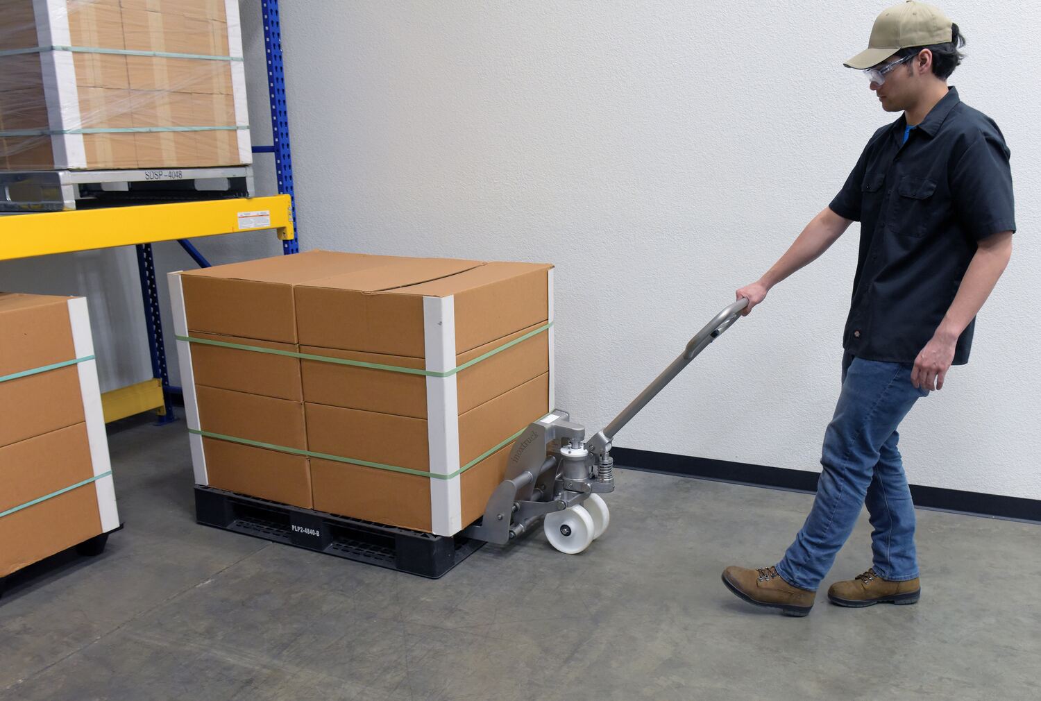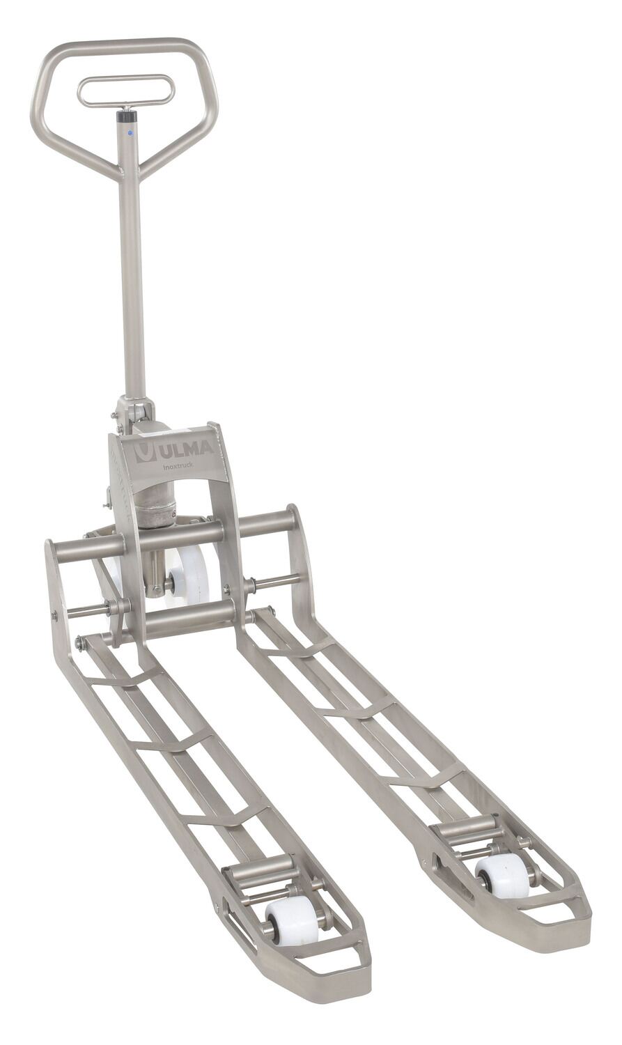 The Stainless Steel Hydraulic hand pump pallet jack works well food handling and other hygienic environments. The stainless steel construction including hydraulic cylinders and piston, is not only strong, but also simple to clean. With its open fork design,the jack can be thoroughly detailed before/after transferring products. The height of the ergonomically friendly handle diminishes slouching and can be rotated for simple maneuvering of products down narrow corridors and pathways. All bearings are sealed for waterproof protection during both use and cleaning.