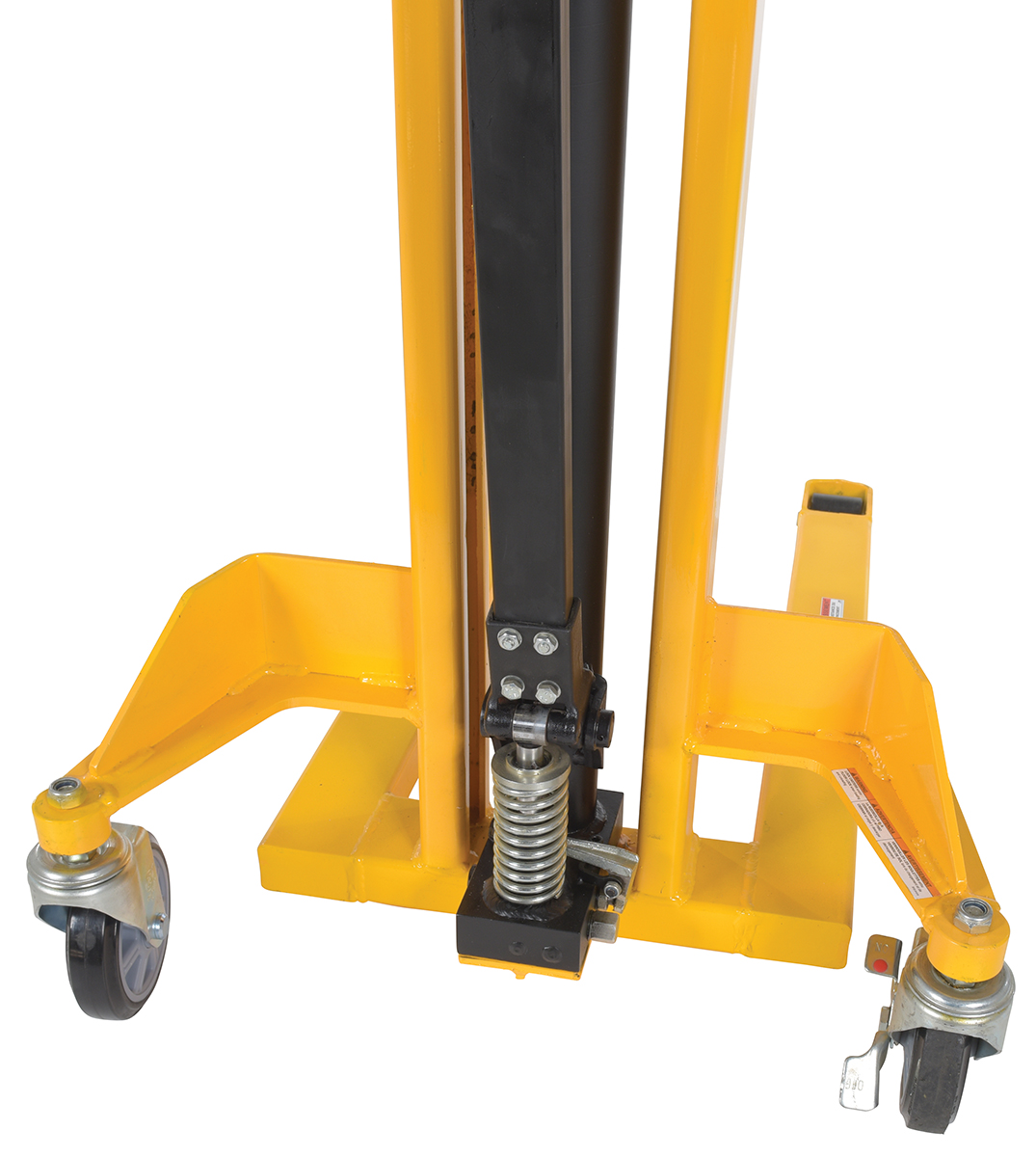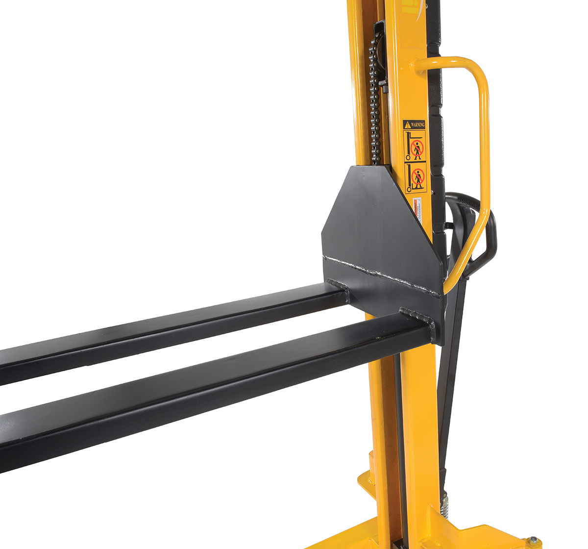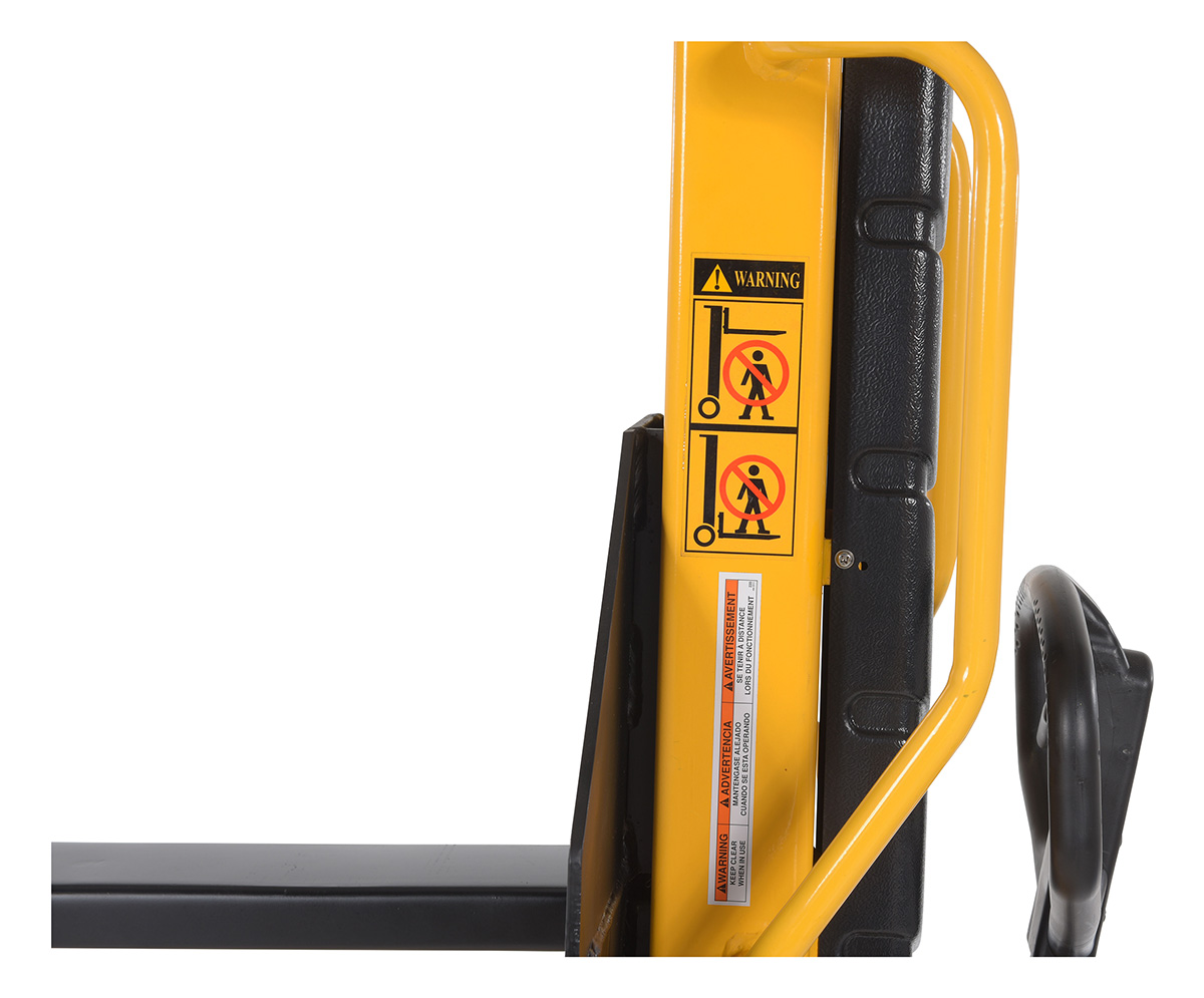 Steel Manual Stacker Narrow Mast Fixed Forks/Legs 1,000 Lb. Capacity Black / YellowSturdy and compact to fit through standard doors. Forks are raised by manual hydraulic hand pump operation and released by a lever situated on the handle. 1" lift per handle pump. Two rigid and two swivel wheels standard.