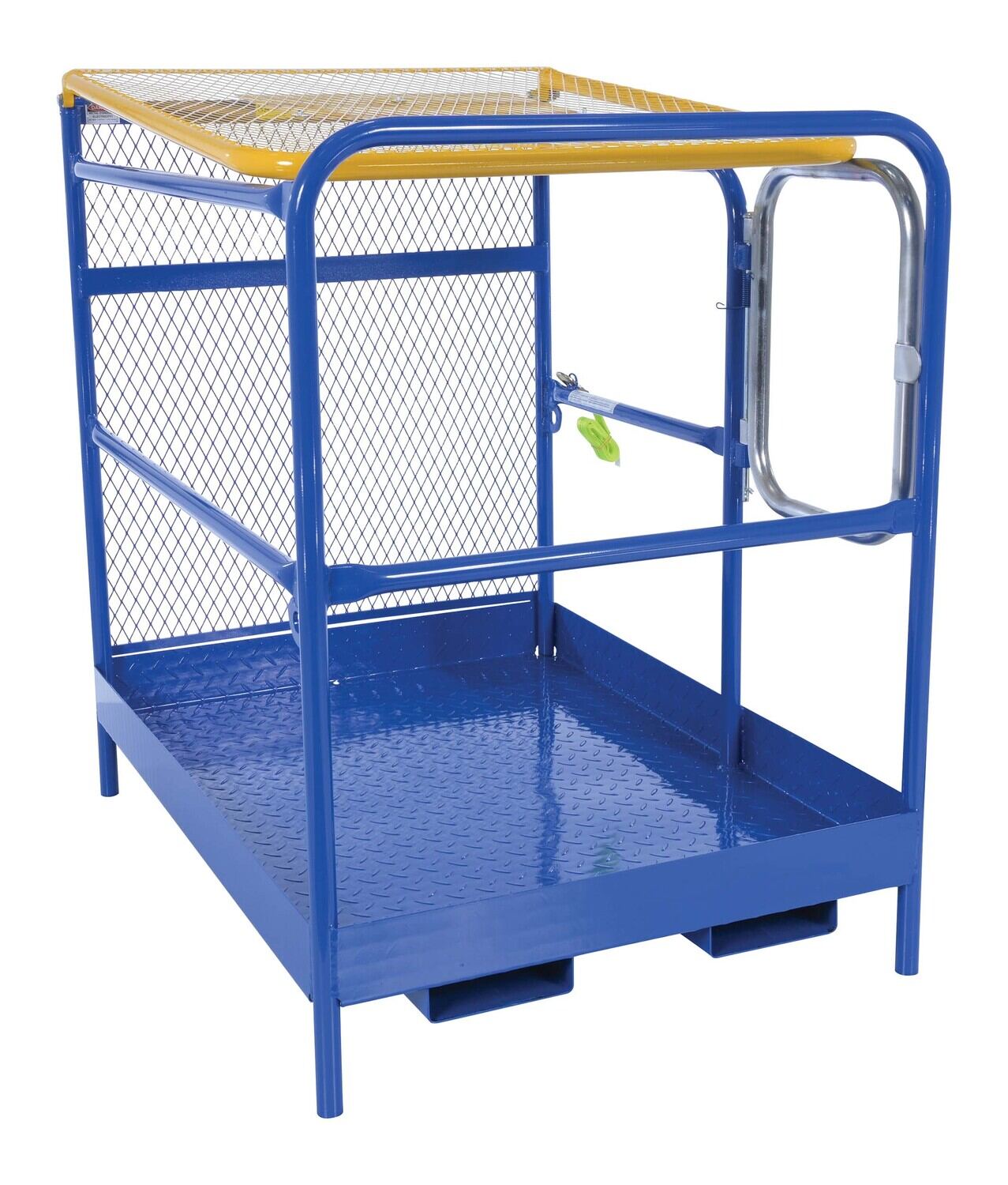 Steel Work Platform With 84 In. Expanded Back 36 In. x 48 In. 1,000 Lb. Capacity BlueThis convenient fork truck work platform quickly and safely raises maintenance personnel where they are needed. Attaches to fork truck by inserting forks into fork pockets and securing platform to fork truck. Fork locks secure platform to forks. Dual handrails on three (3) sides with expanded metal backing on the fourth side. Includes checker floor plate platform and long strap with hook to attach platform to fork truck. A maximum of two (2) people can be in the work platform at one time. Meets California OSHA specifications.