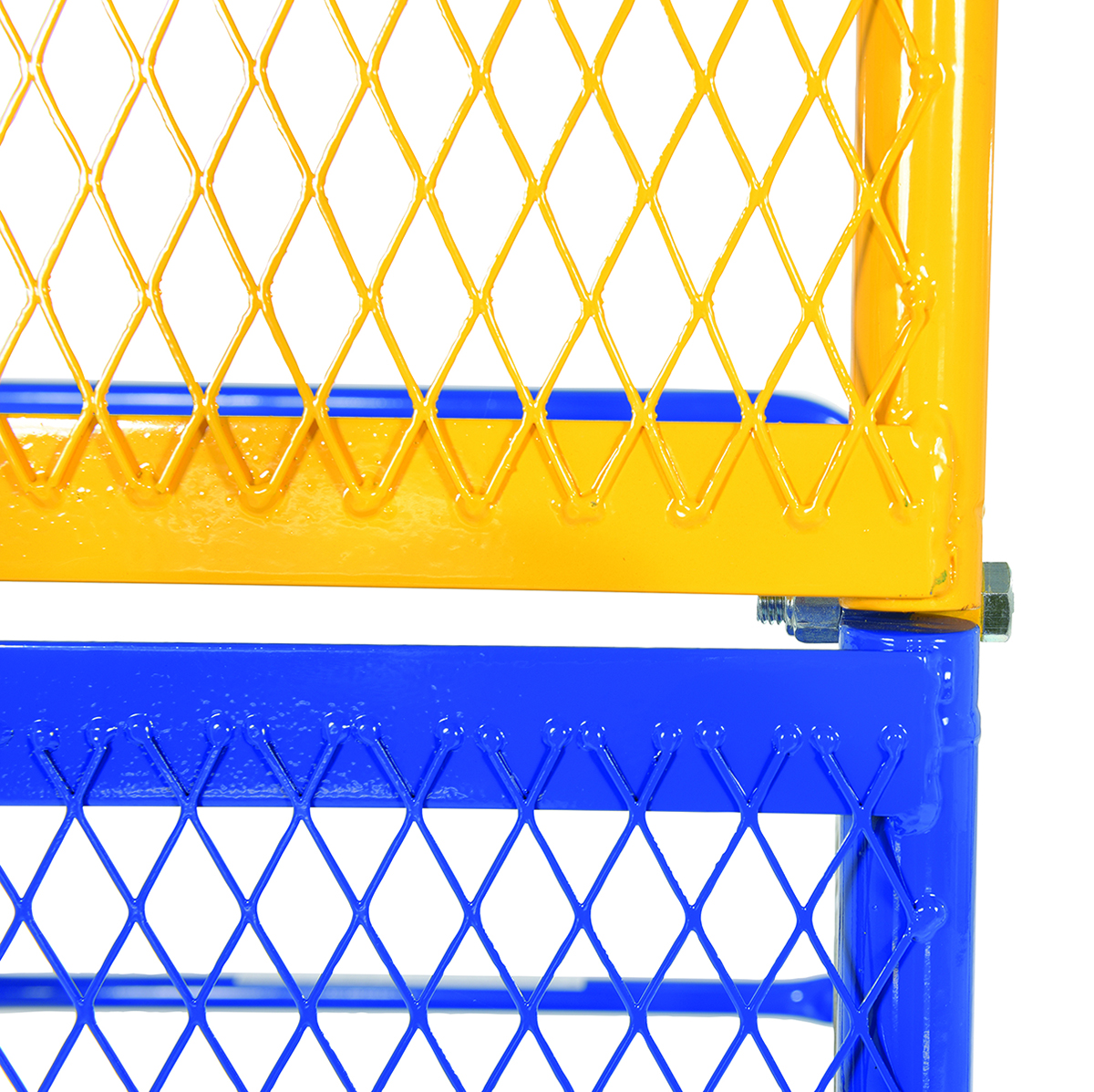 Steel Work Platform With 2 Door Entry and 84 In. Expanded Back 36 In. x 48 In. 1,000 Lb. Capacity BlueThis convenient fork truck work platform quickly and safely raises maintenance personnel where they are needed. Attaches to fork truck by inserting forks into fork pockets and securing platform to fork truck. Fork locks secure platform to forks. Dual handrails on three (3) sides with expanded metal backing on the fourth side. Includes checker floor plate platform and long strap with hook to attach platform to fork truck. A maximum of two (2) people can be in the work platform at one time. Meets California OSHA specifications.