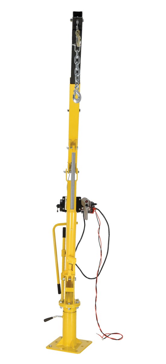 Steel DC Powered Winch Truck Jib Crane 44 In. Reach 1,000 Lb. Extended Capacity YellowInstalled in your pick-up truck bed, this winch operated jib crane will help lift loads. Lift items from ground to truck bed height, then rotate into cargo area. Includes telescopic boom design with manual hydraulic hand pump to pivot boom up and down. DC powered cable winch to lift and lower loads. Unit comes with one fixed hook, one chain slot lock, and one cable hook with latch.